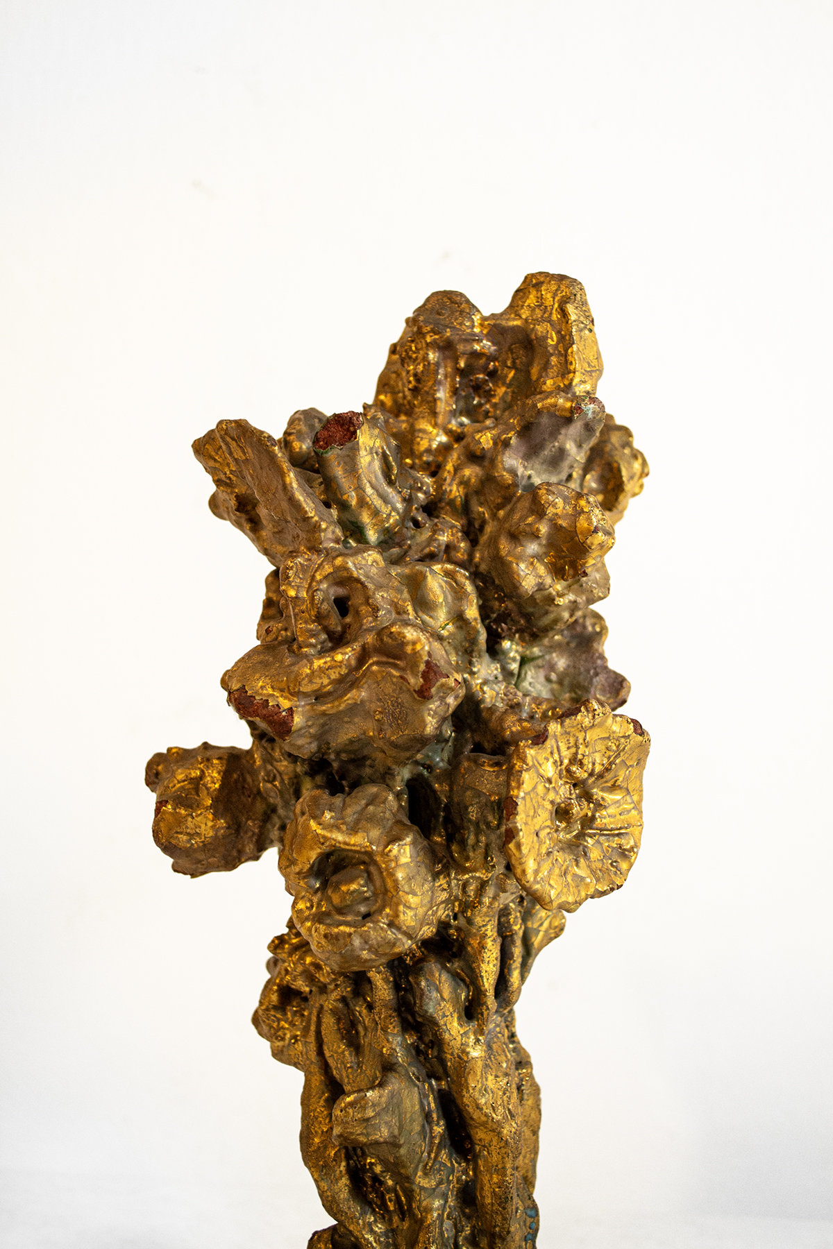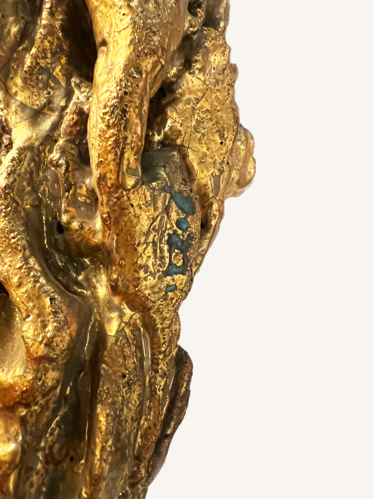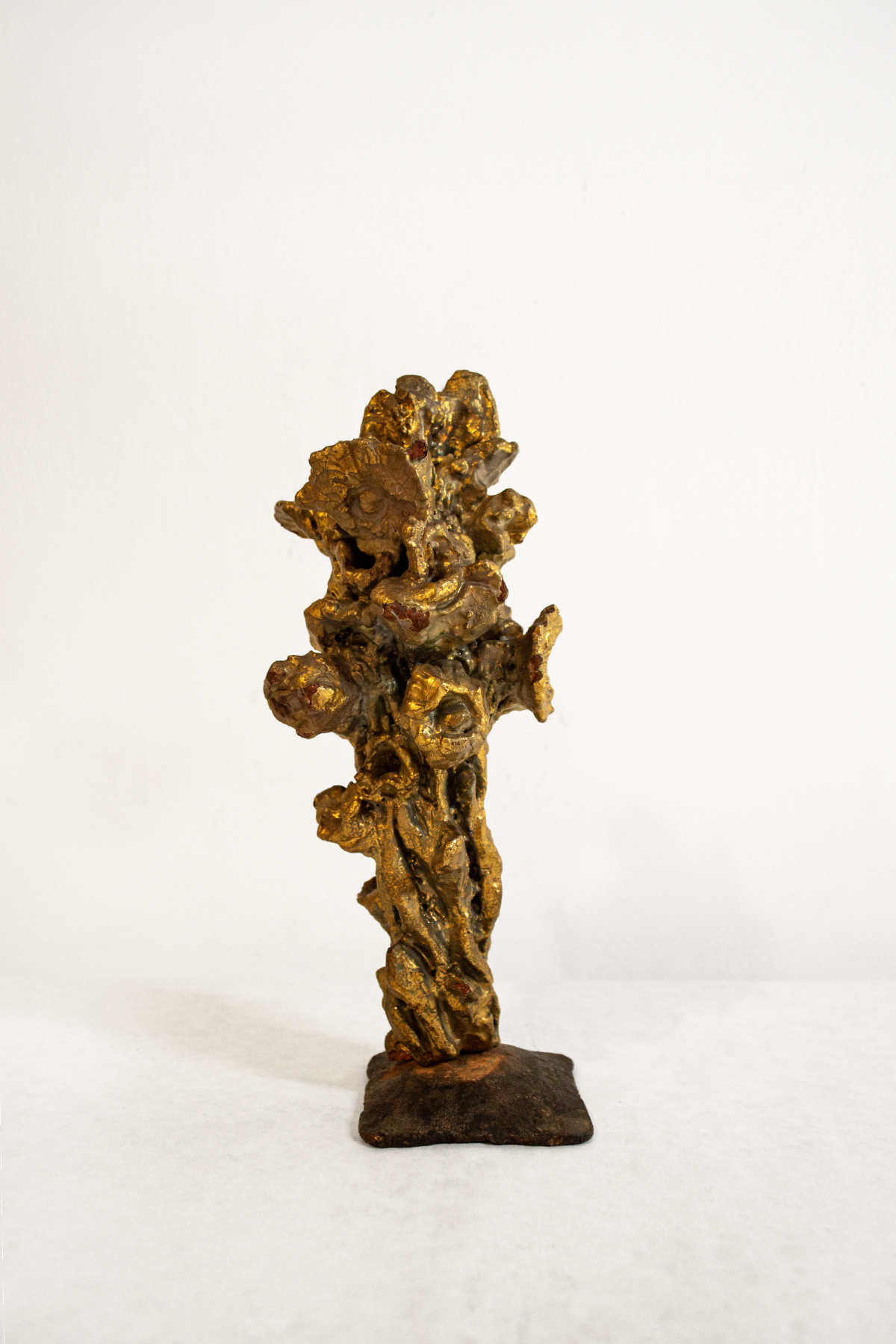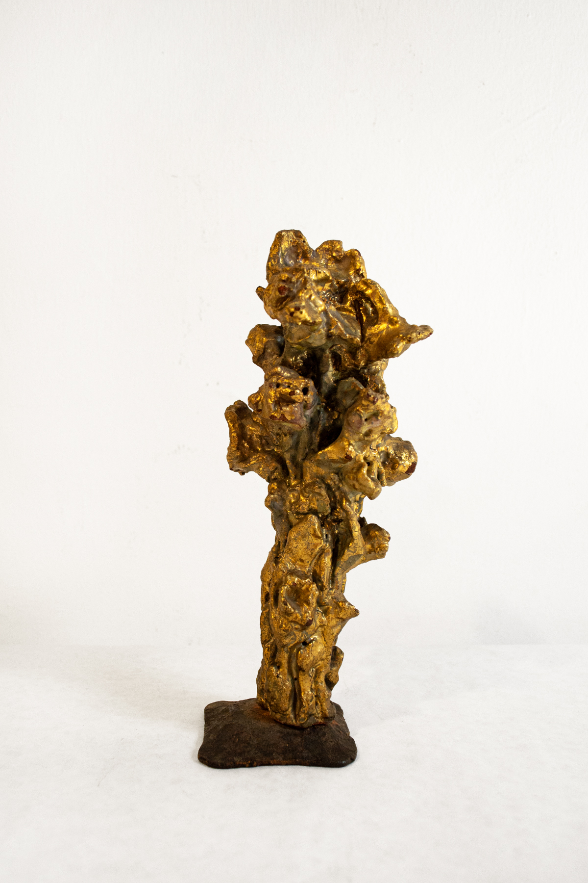 Scultura in terracotta dorata a fuoco con base in ferro forgiato.