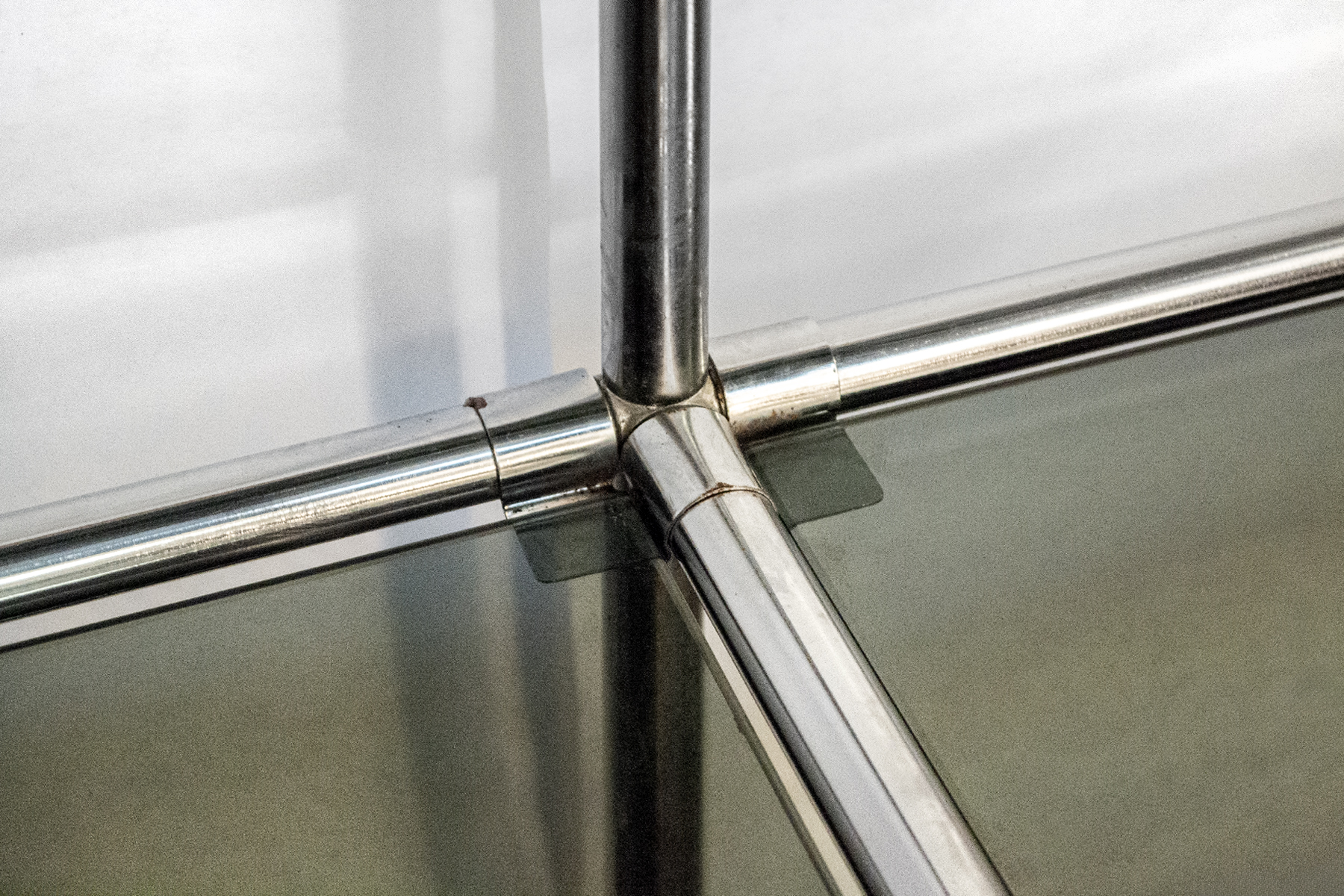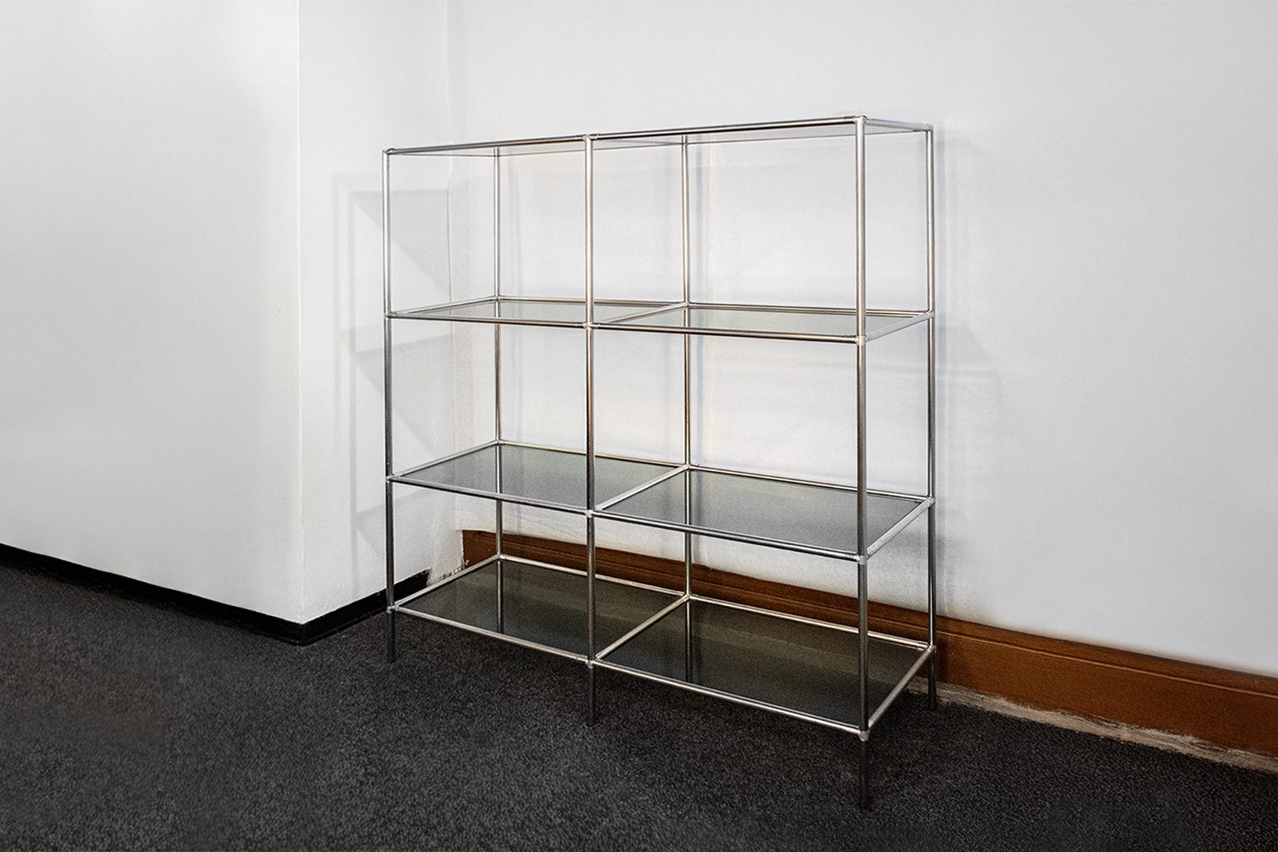 Scaffalatura indipendente modulare o divisorio per ambienti con struttura in acciaio e piani in vetro.