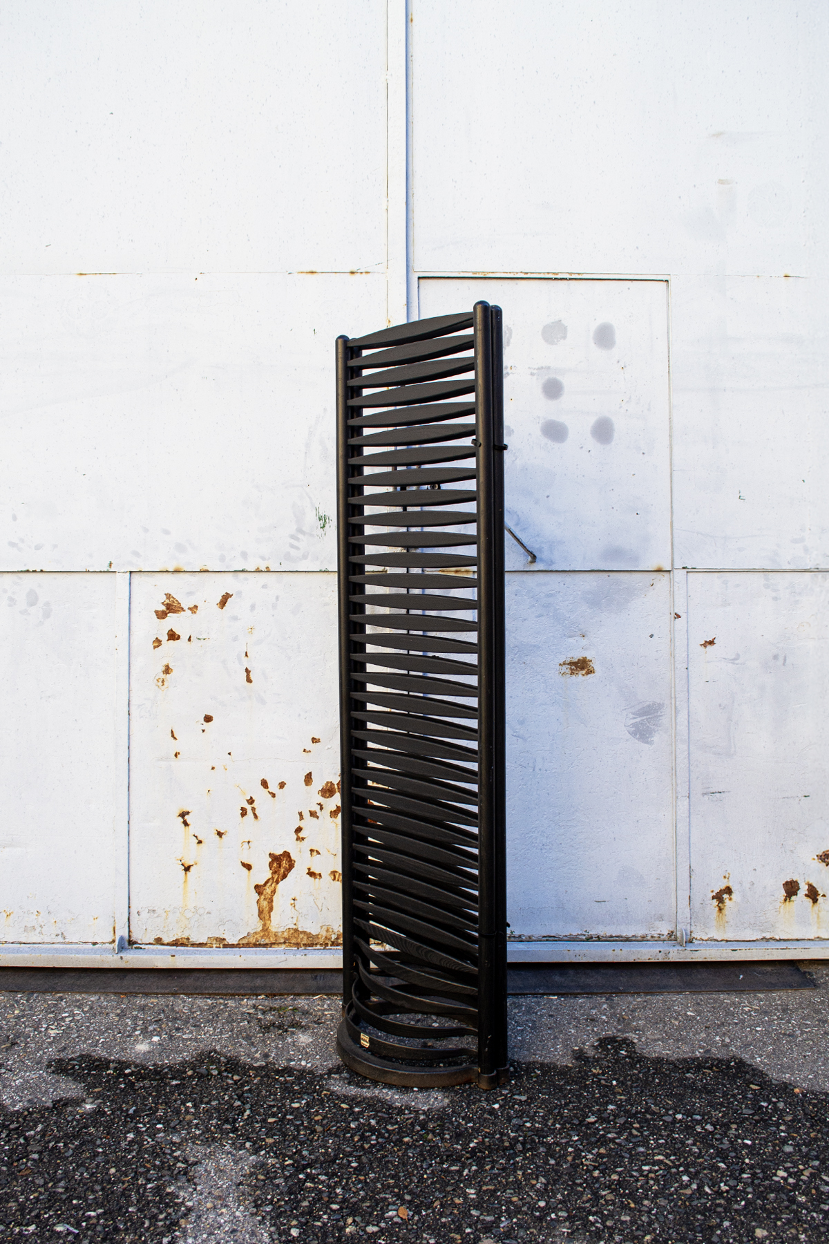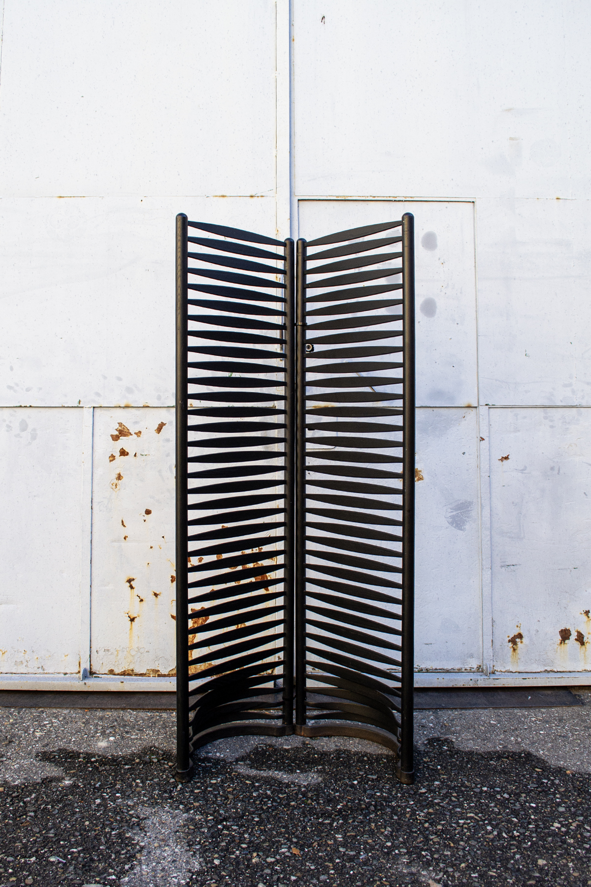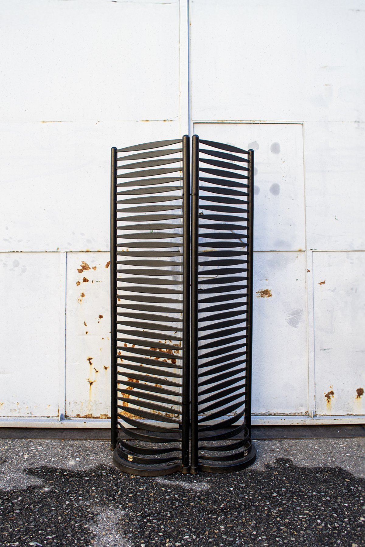 Coppia di paraventi neri in legno laccato con base in ferro.
