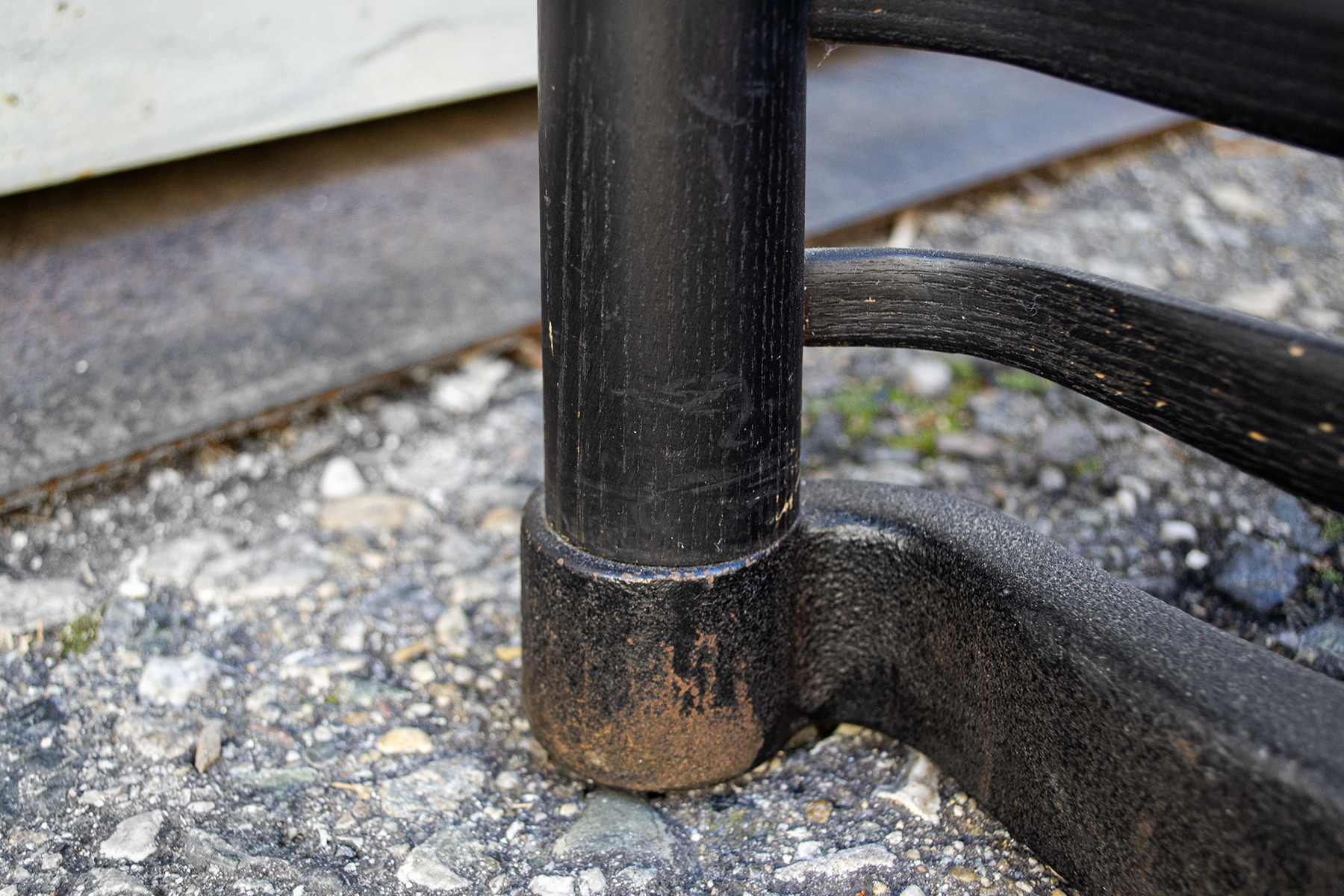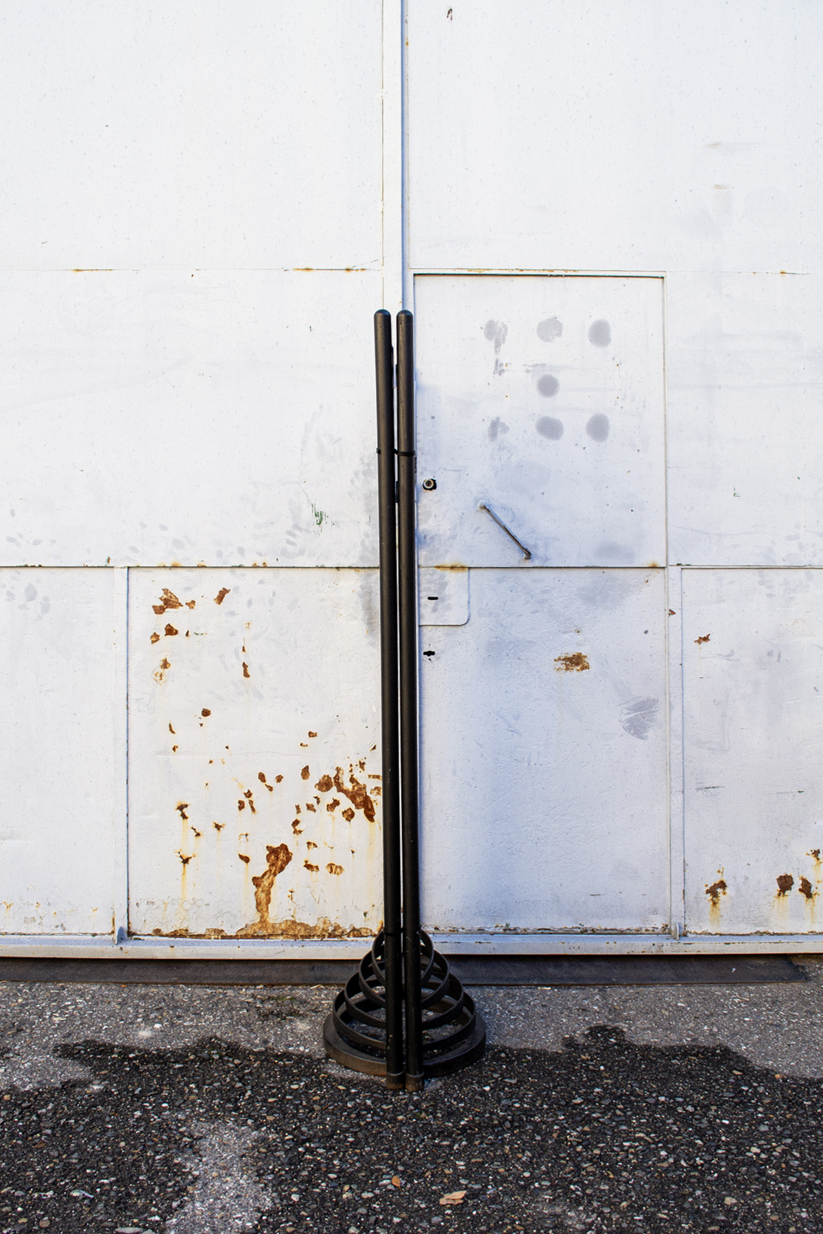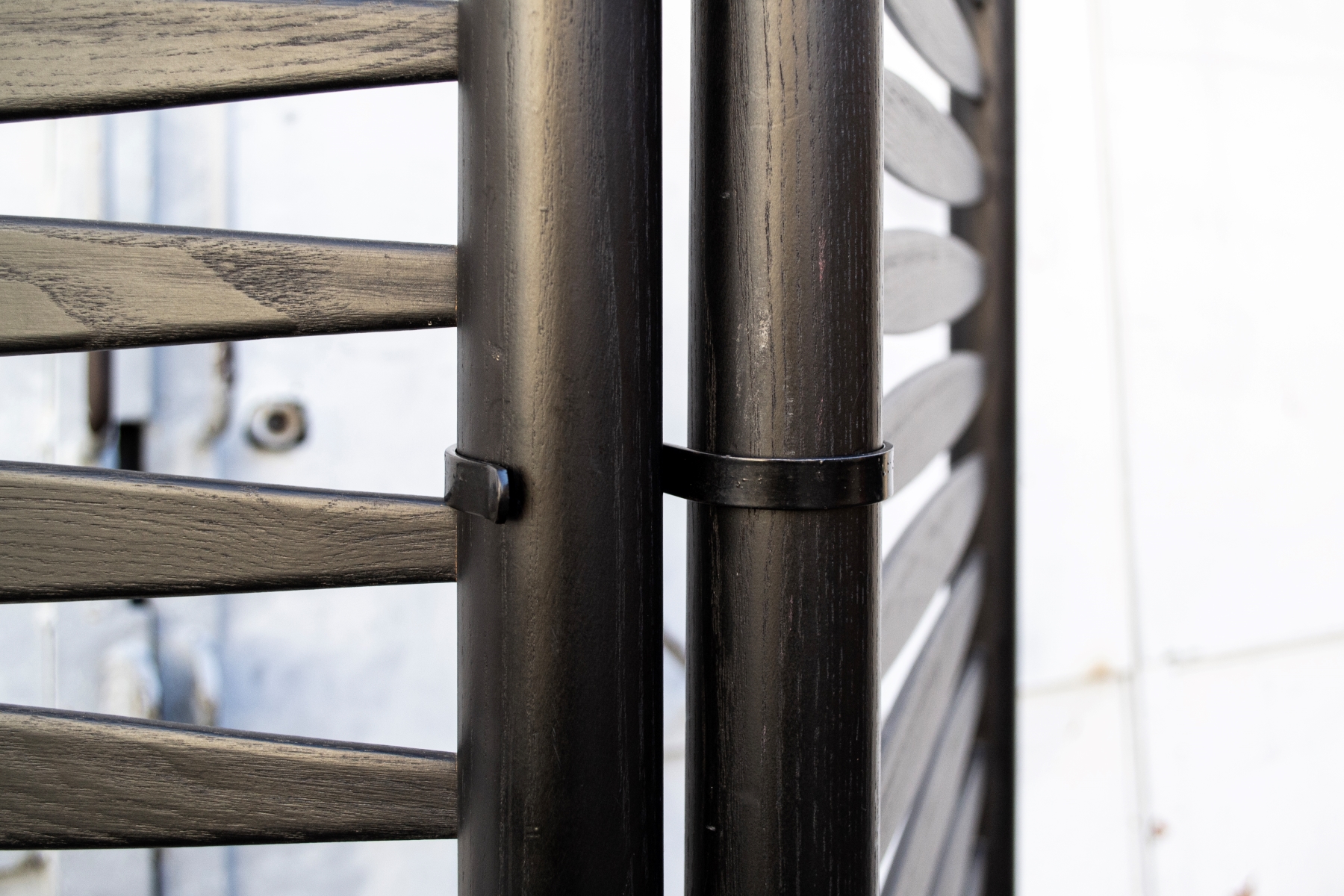 Coppia di paraventi neri in legno laccato con base in ferro.