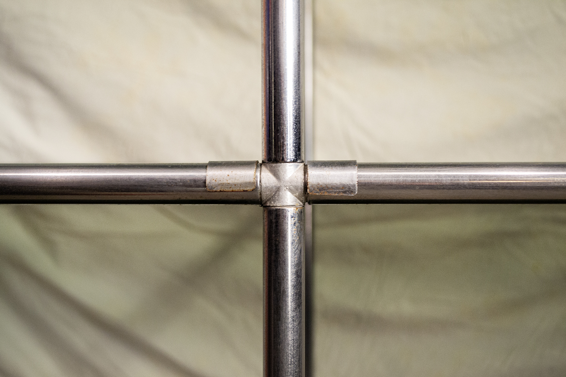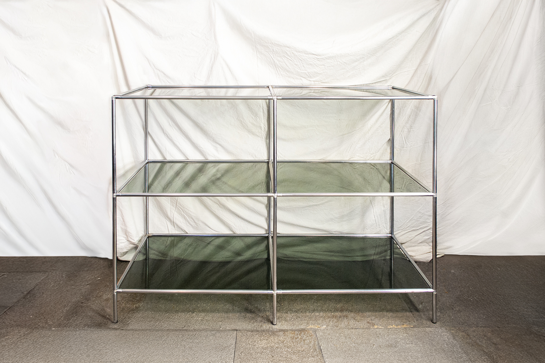 Scaffalatura indipendente modulare o divisorio per ambienti con struttura in acciaio e piani in vetro.