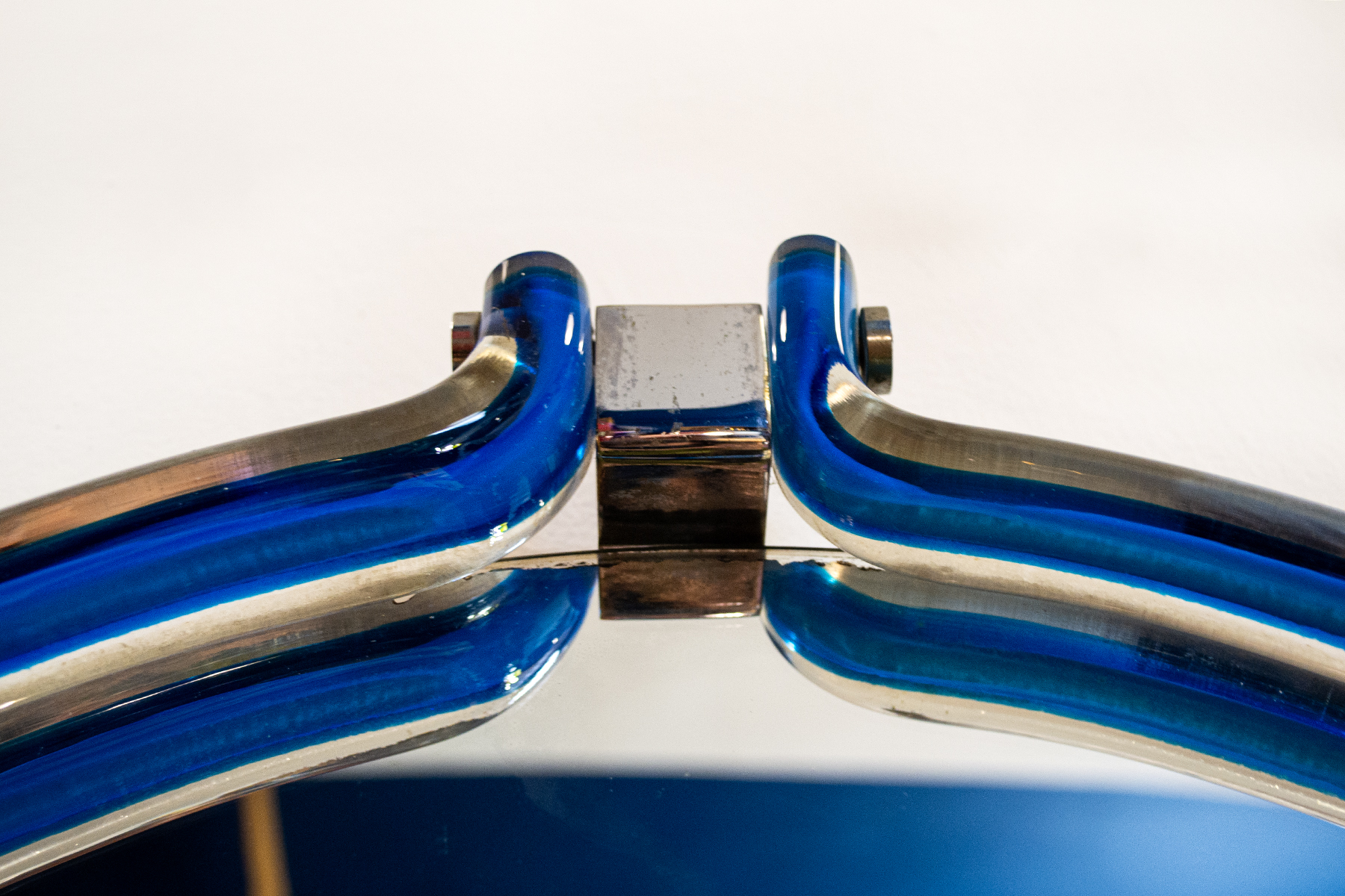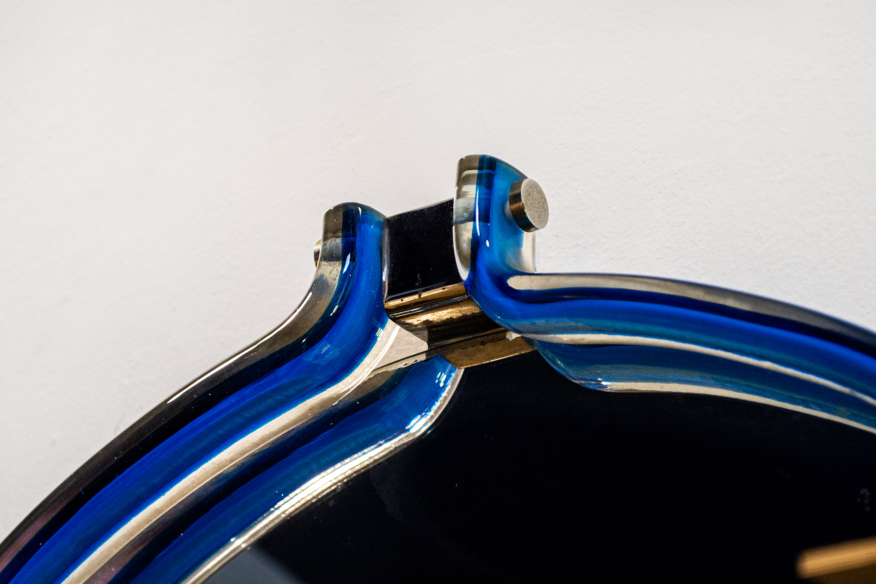 Specchio con struttura in metallo cromato e cornice scultorea in vetro Murano.