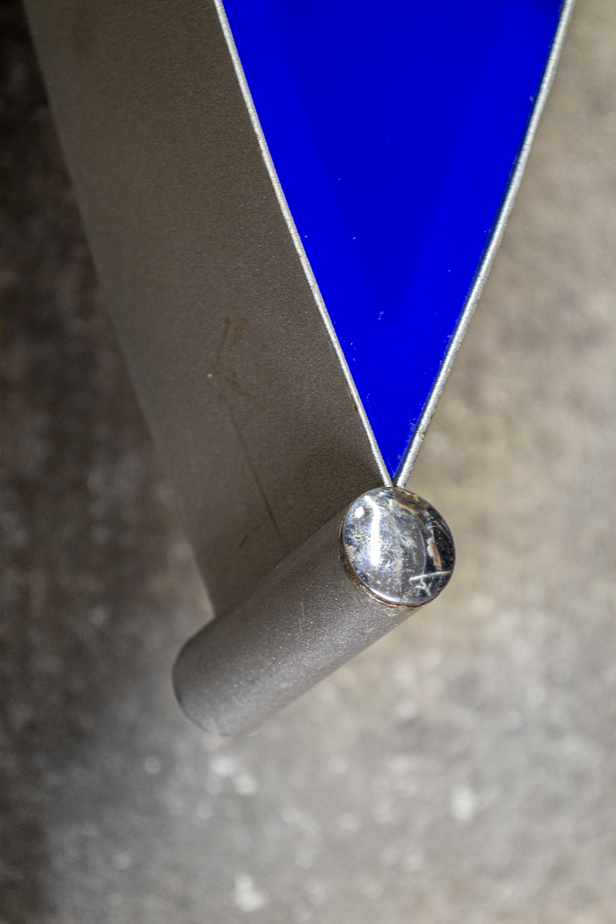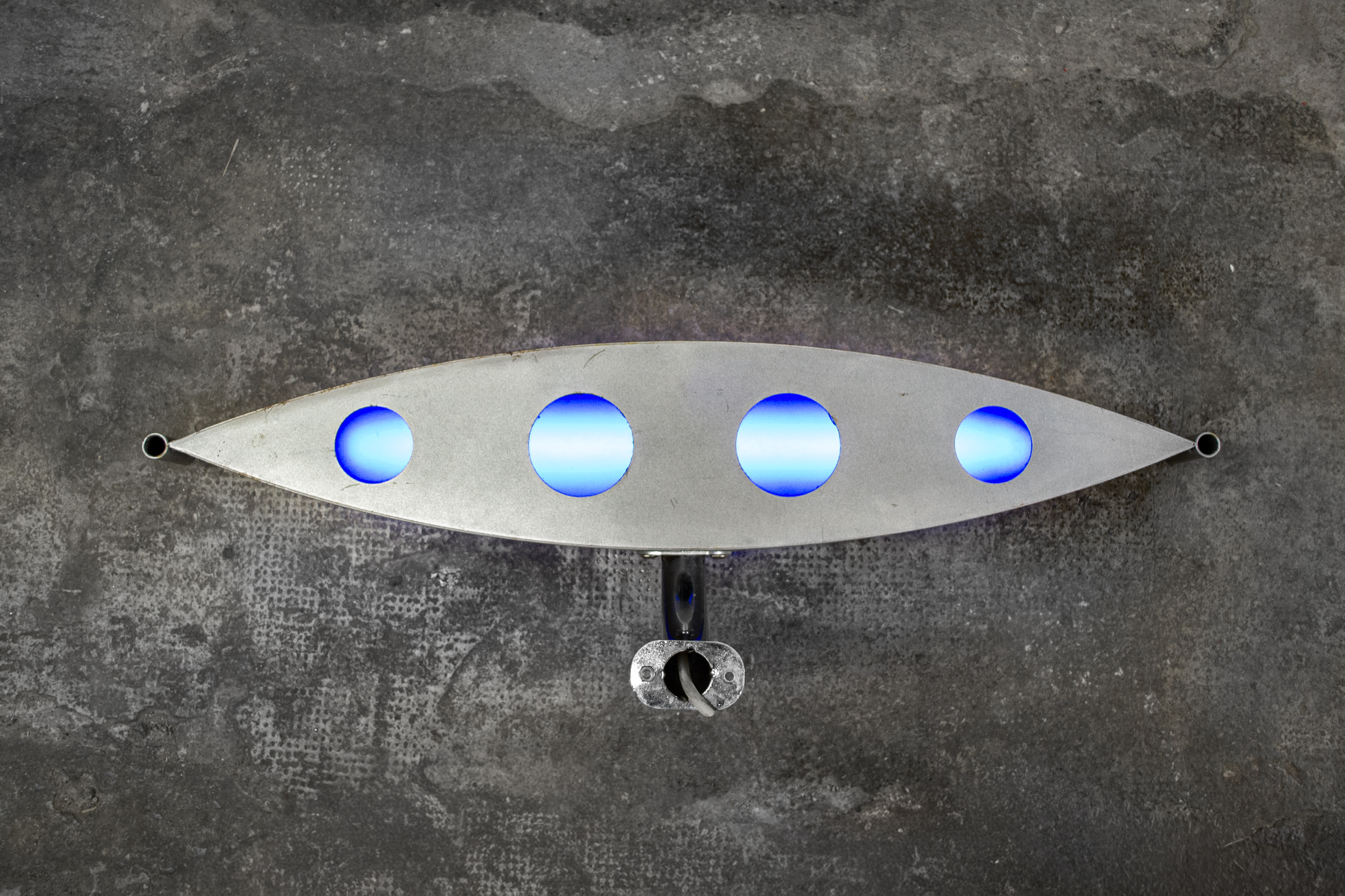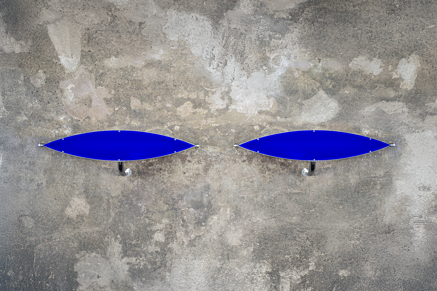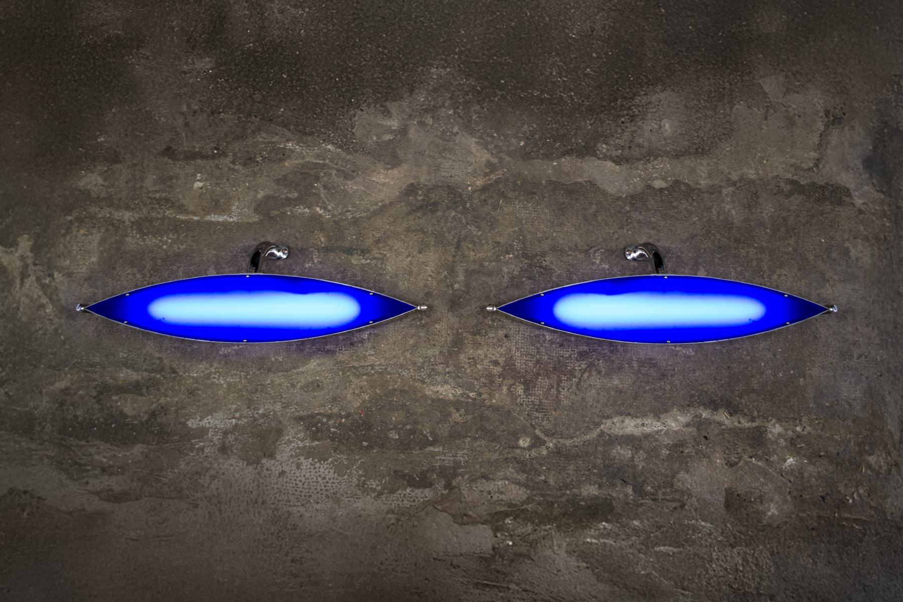 Coppia di applique con struttura in metallo e paralume in plexiglas blu.