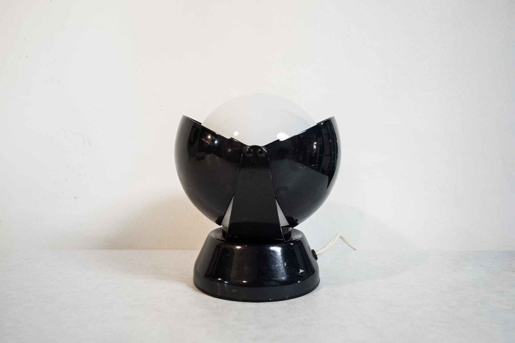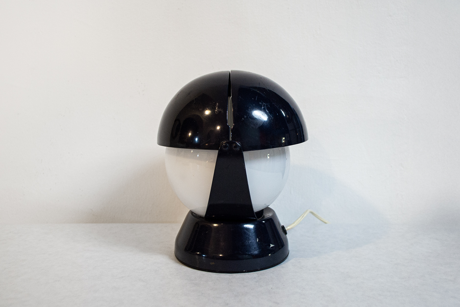 Lampada da tavolo con struttura in metallo laccato, paralume in vetro opalino.