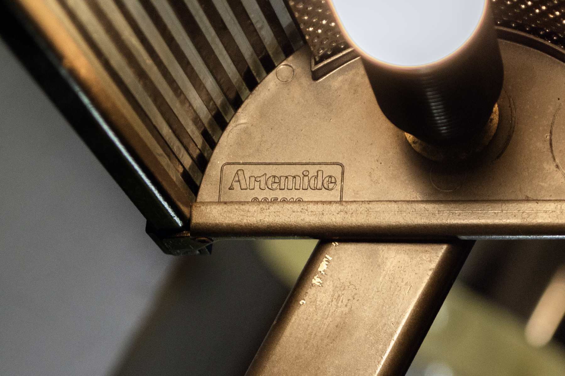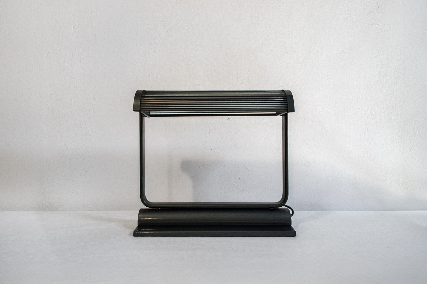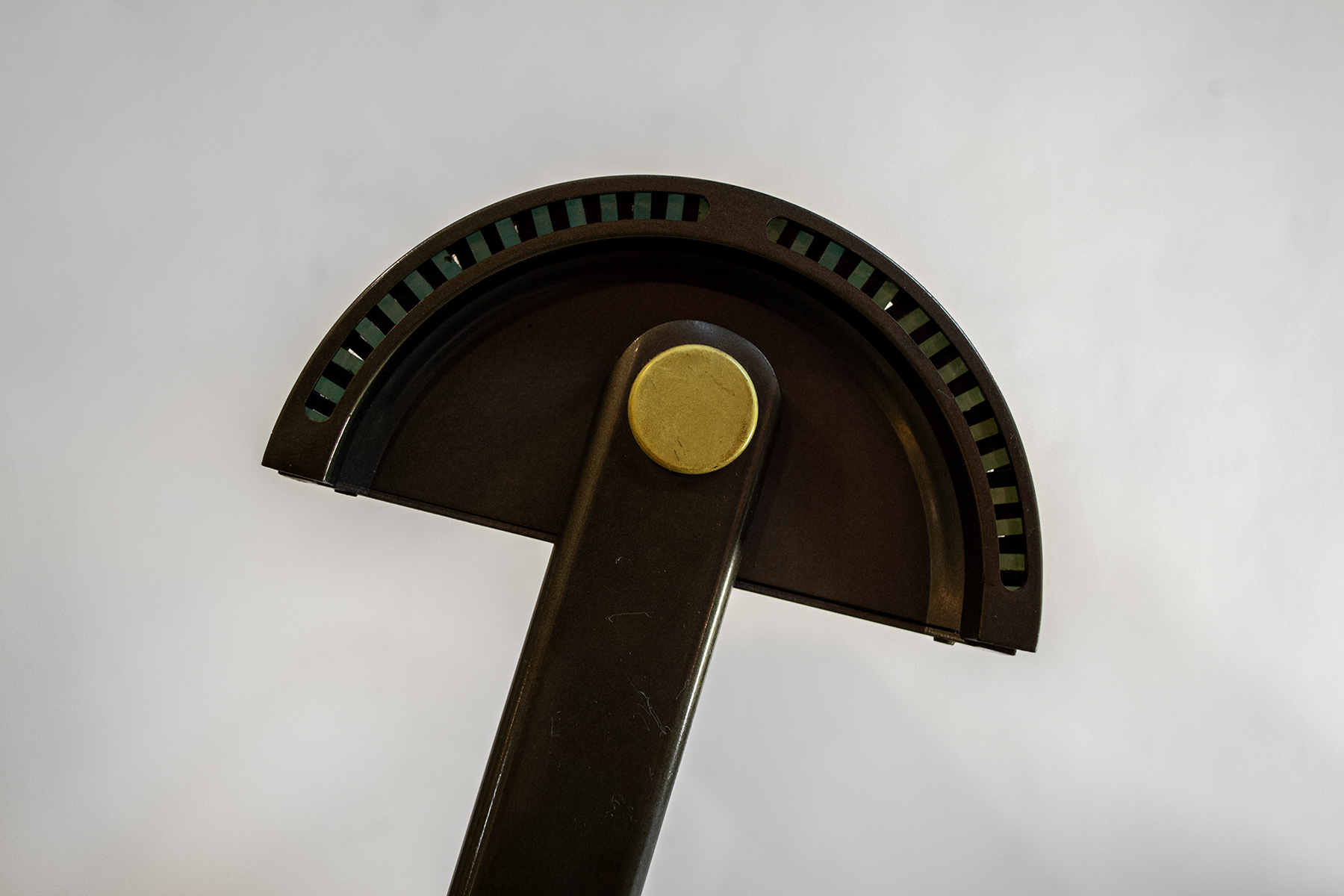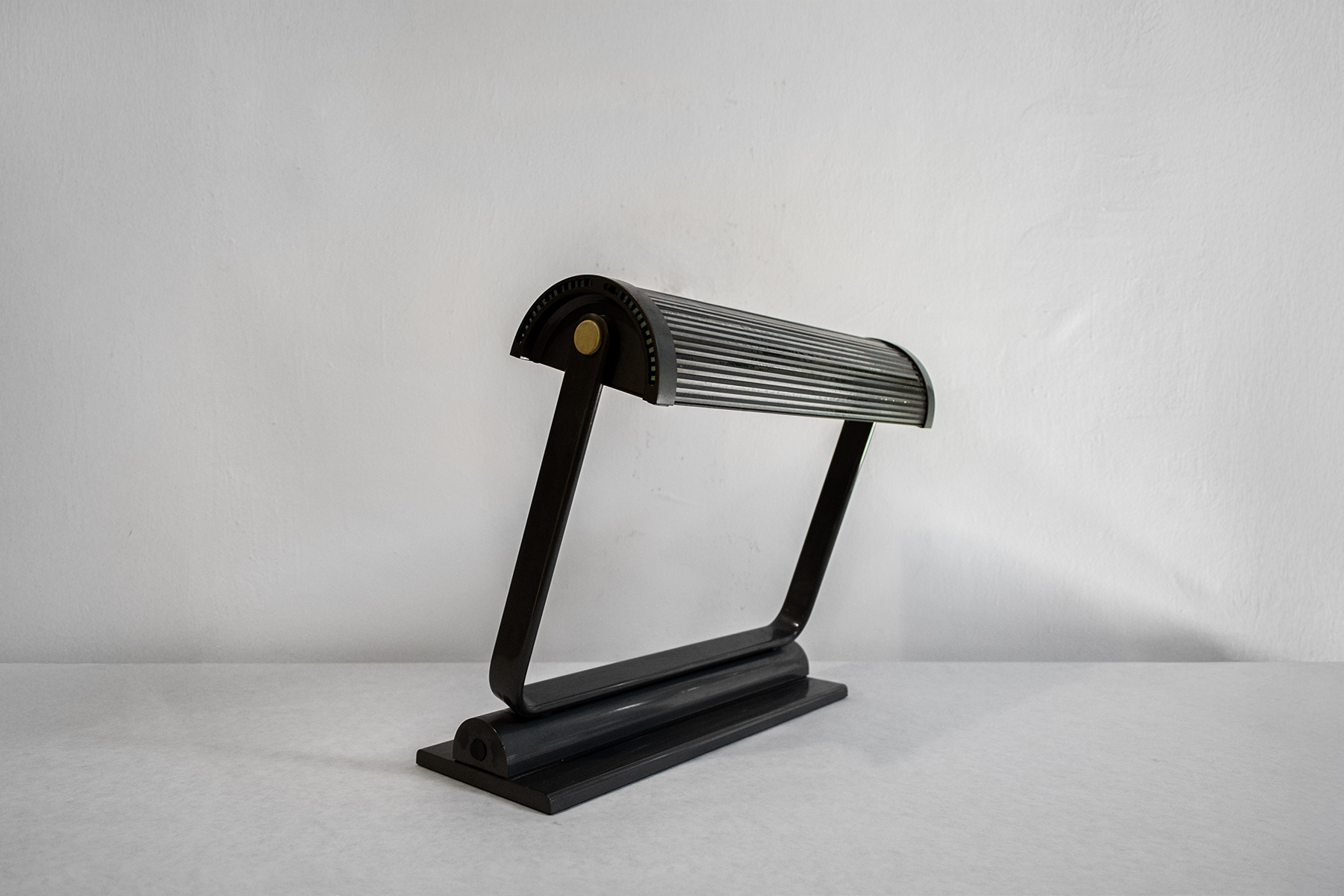Lampada da scrivania con struttura in metallo e paralume in vetro.