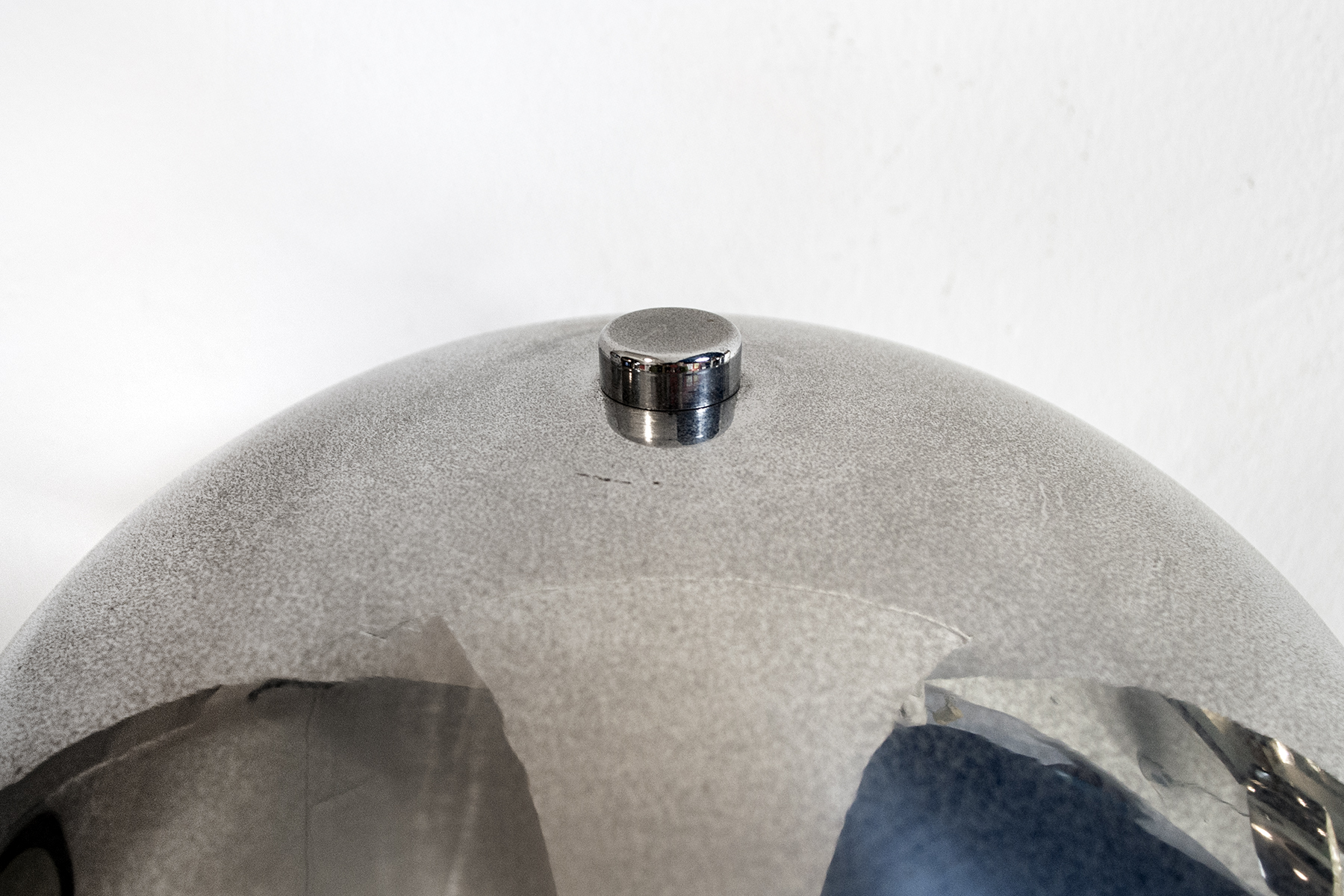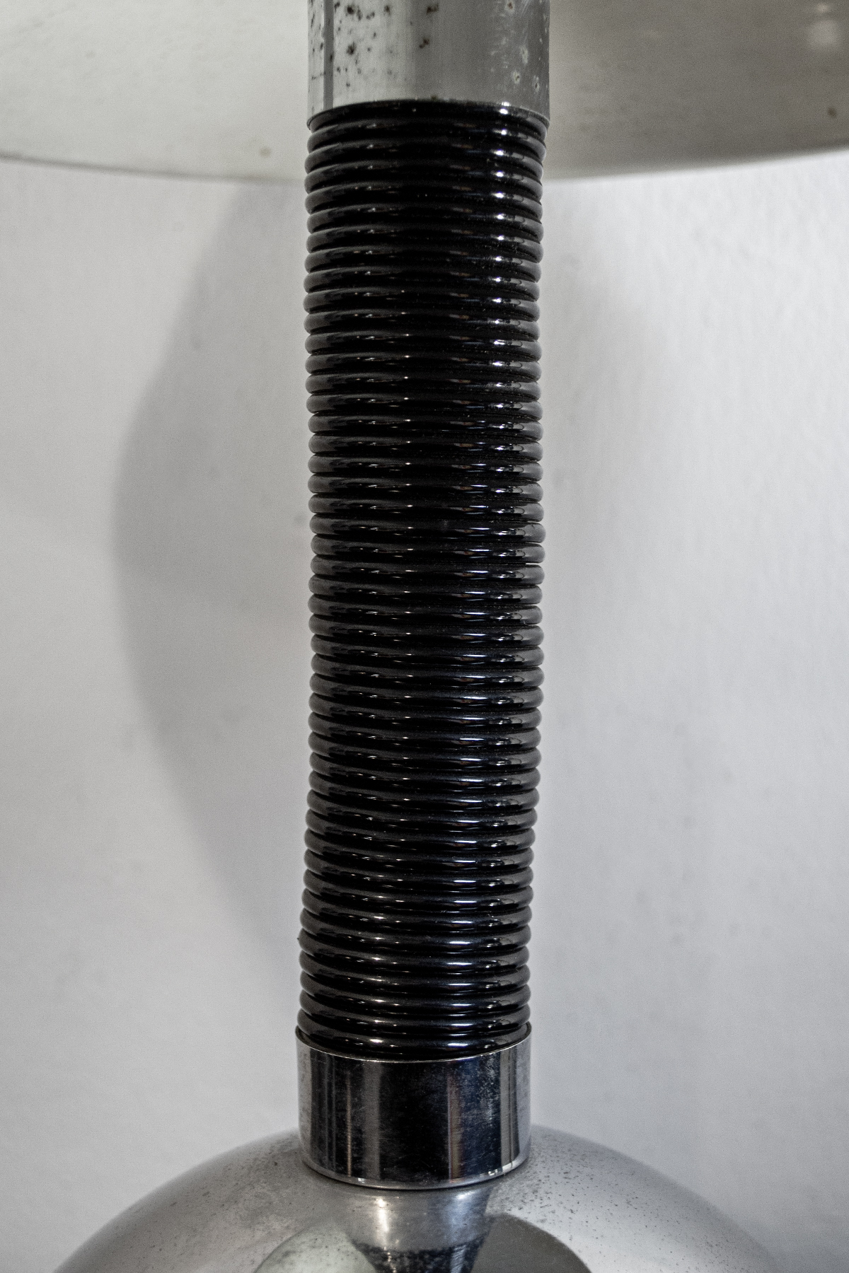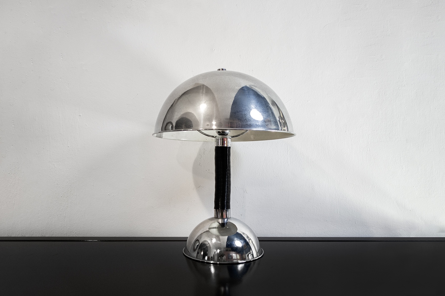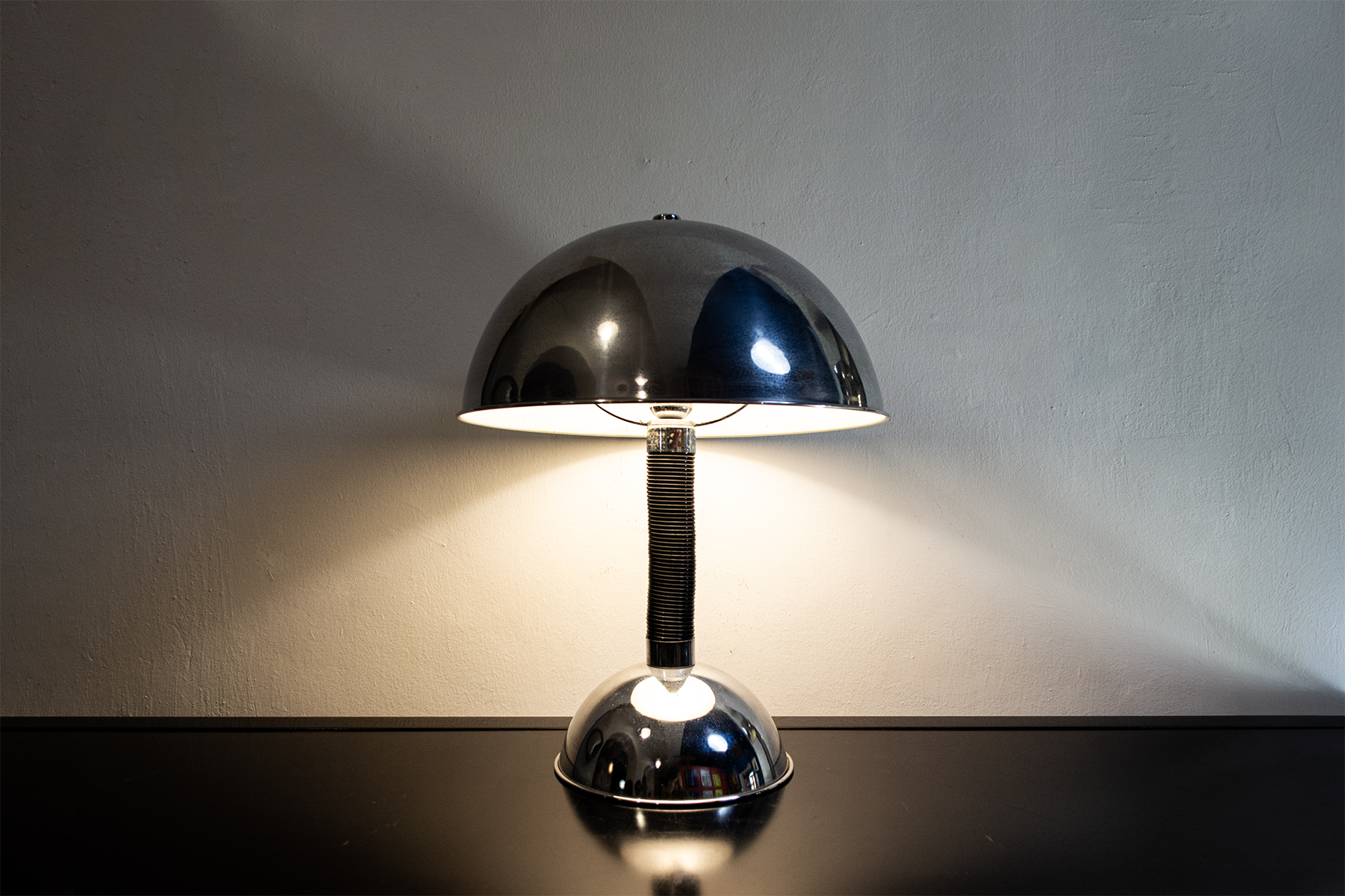 Lampada da tavolo con struttura in metallo cromato e dettagli in gomma.