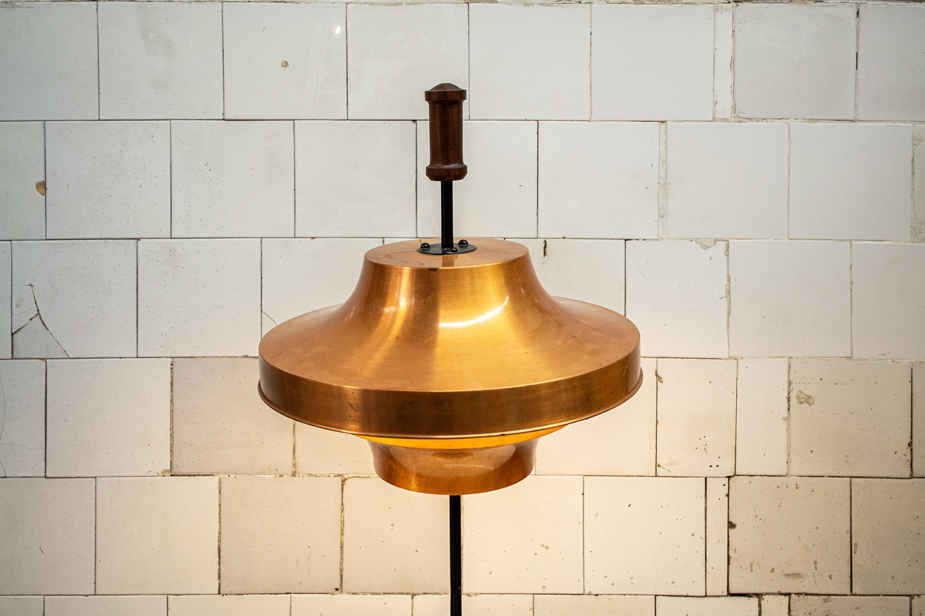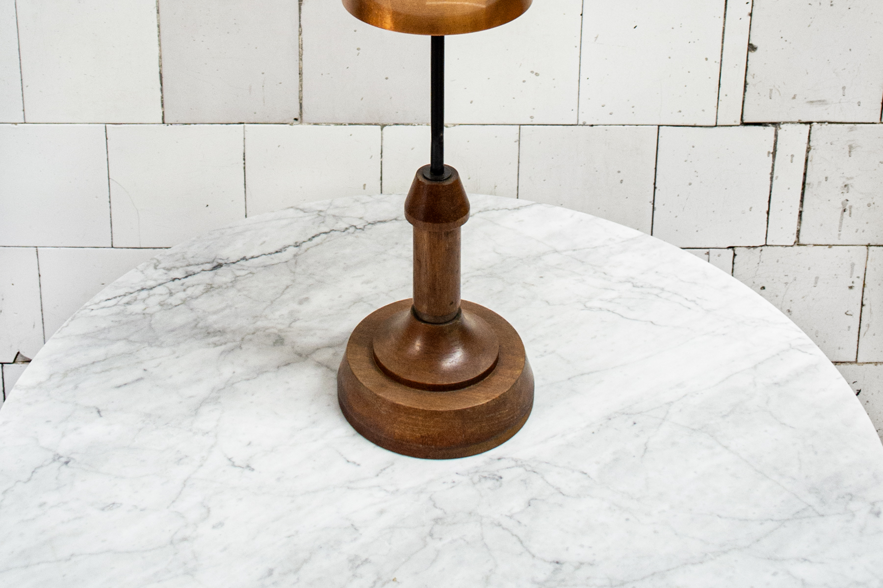 Lampada da tavolo con struttura in legno e paralume regolabile in rame.