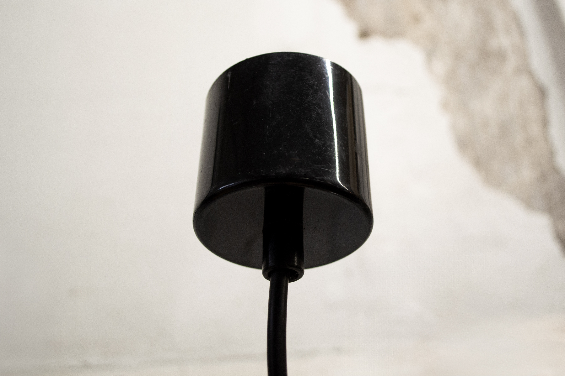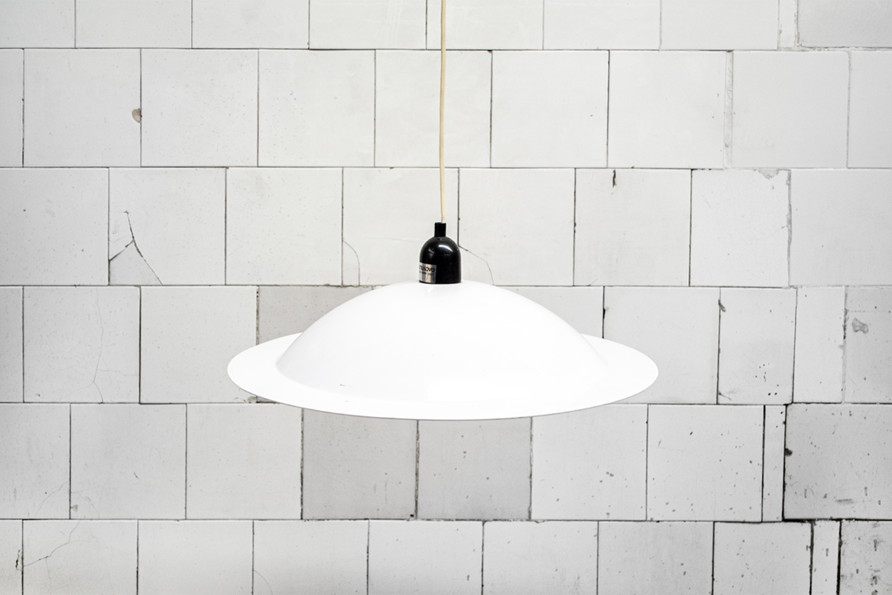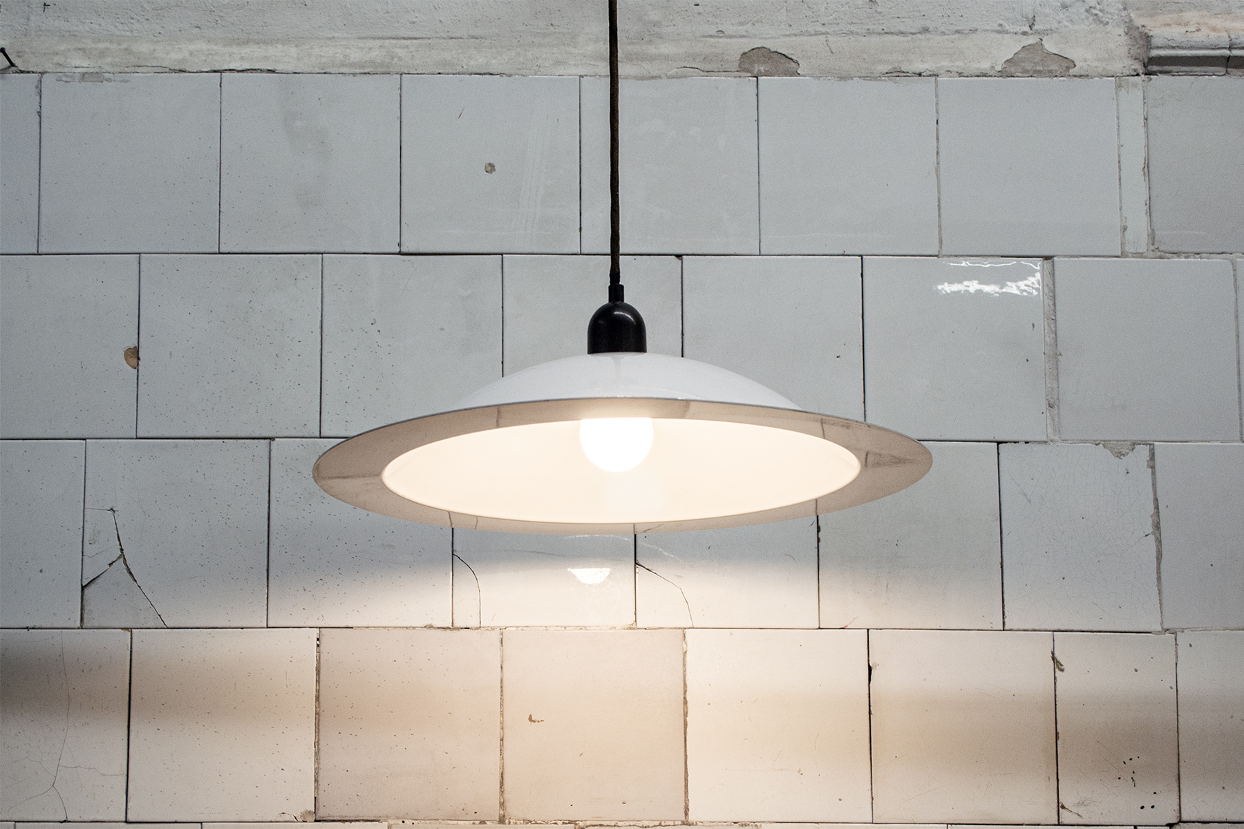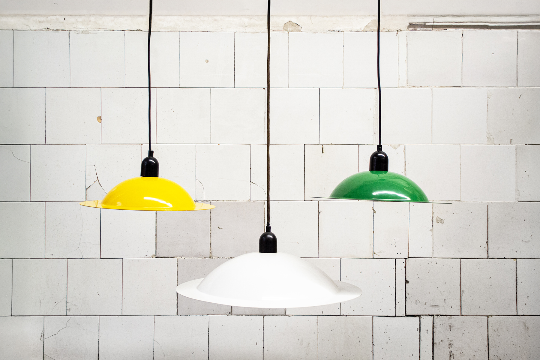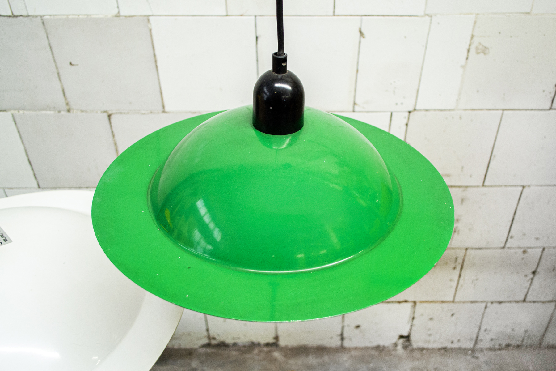 Lampade a sospensione in metallo smaltato verde, giallo e bianco.