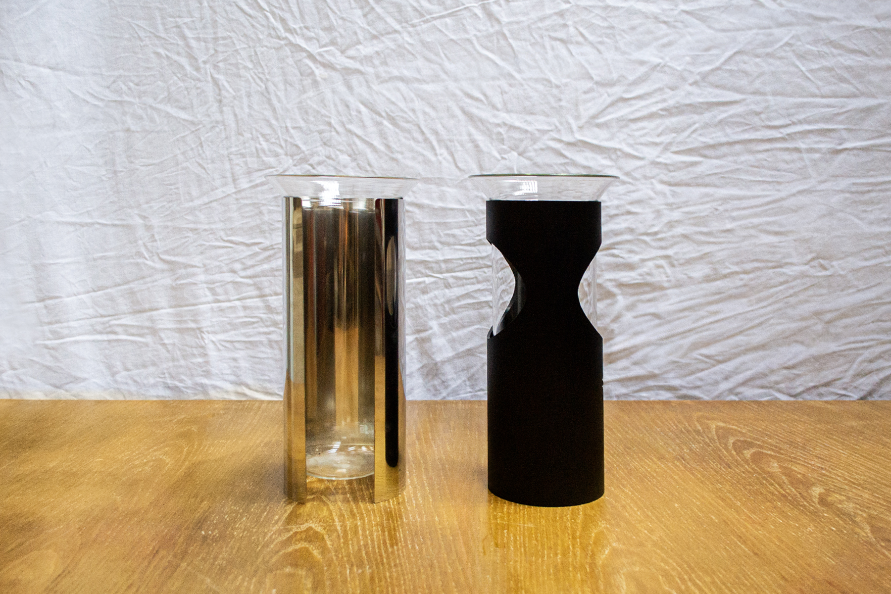 Coppia di vasi in metallo, metallo cromato e vetro.
