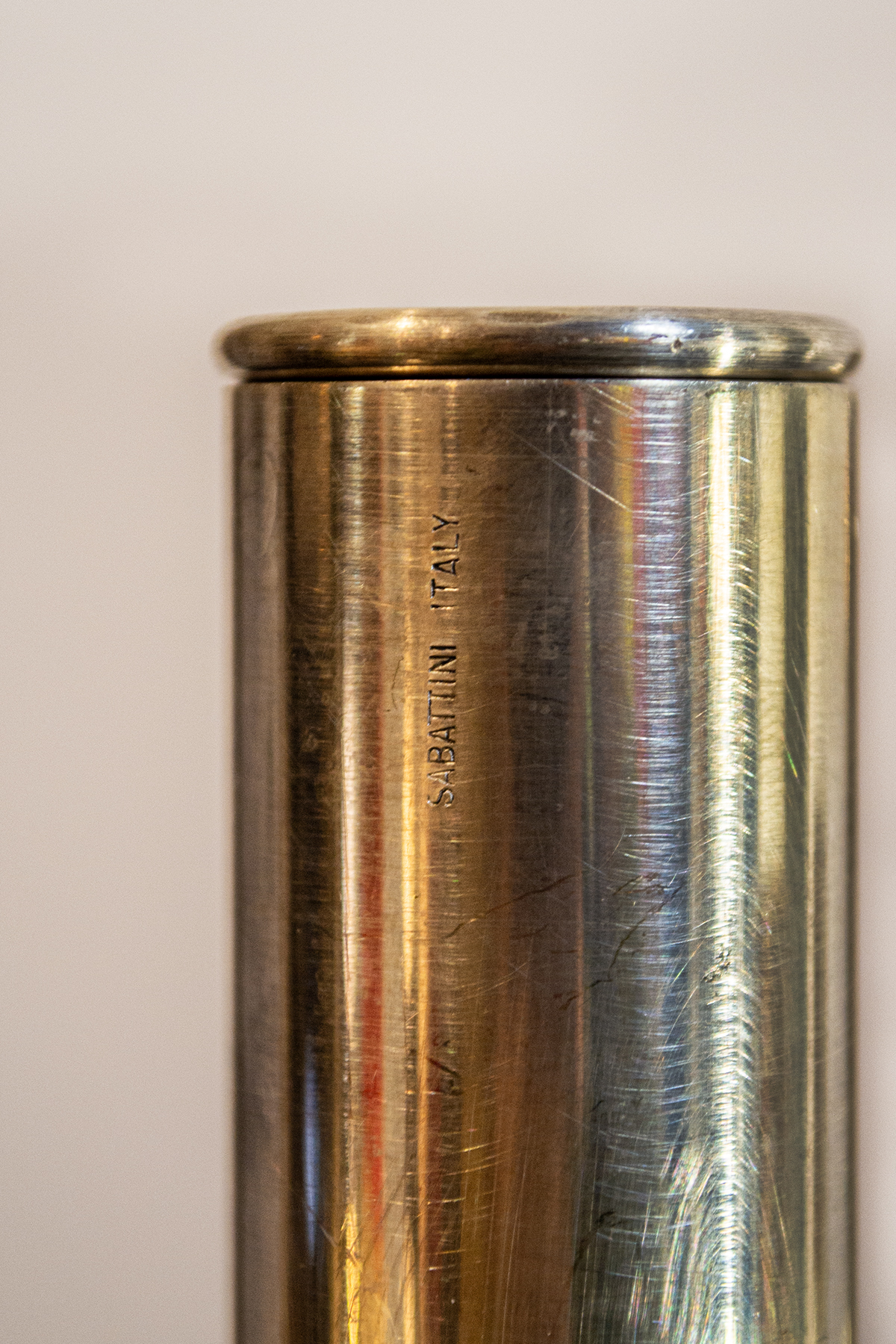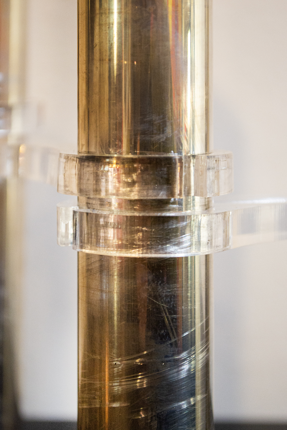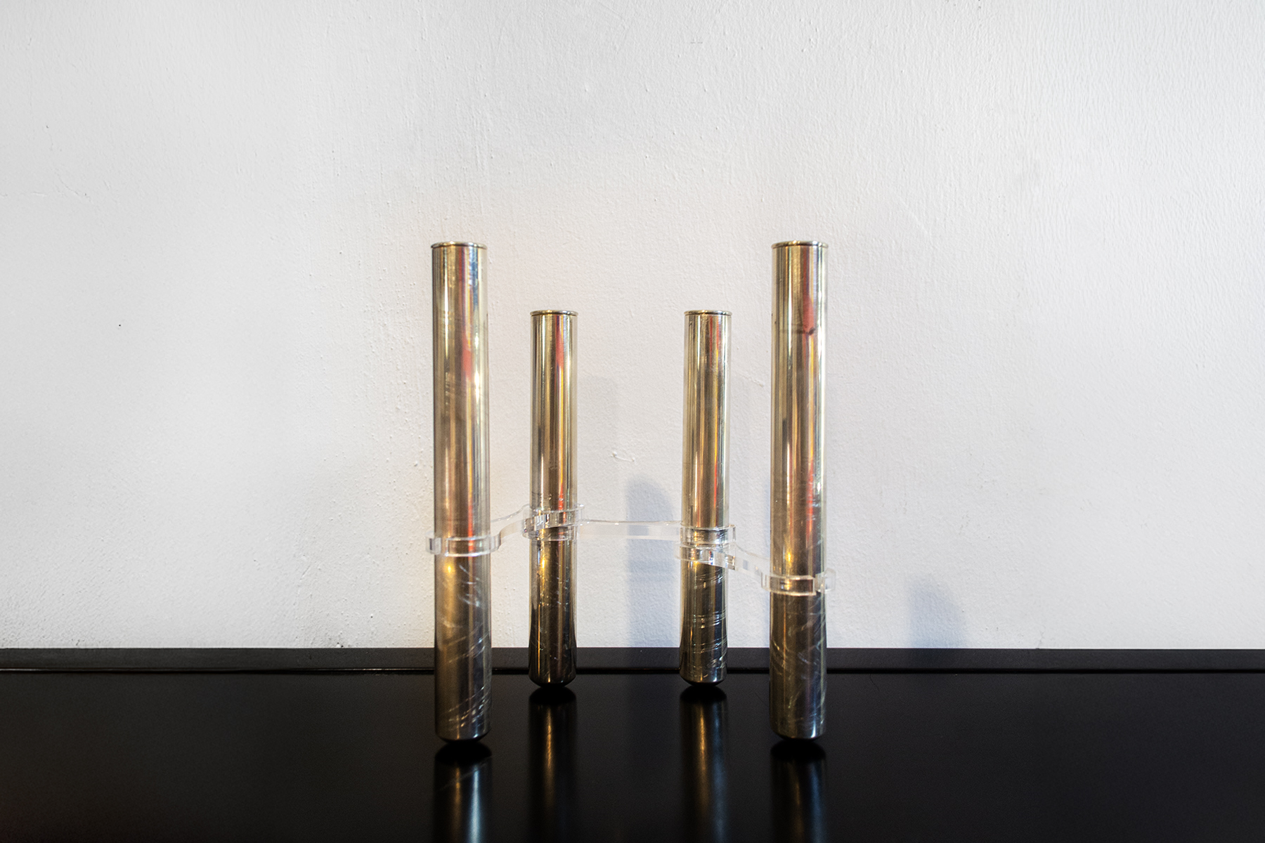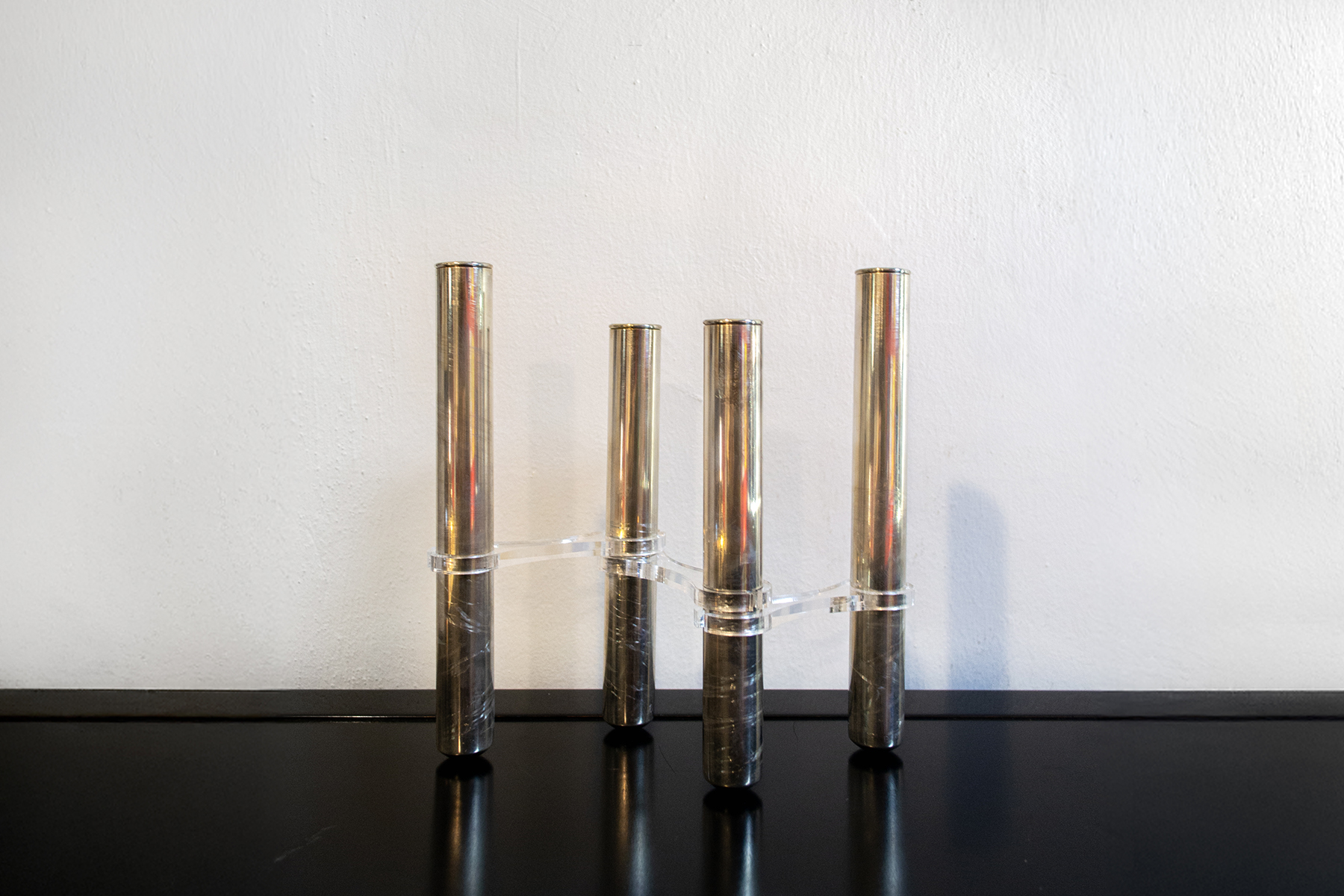 Candelabro con struttura in metallo argentato e dettagli in plexiglass.