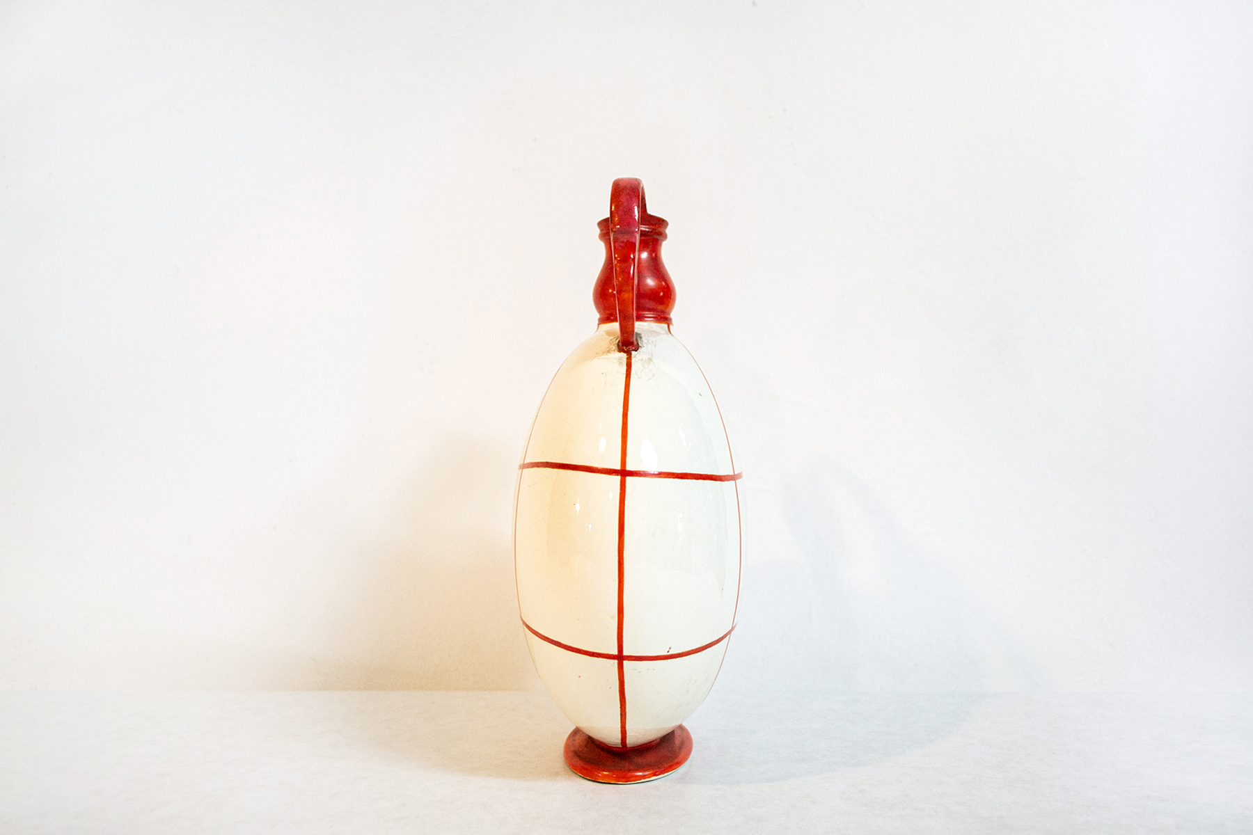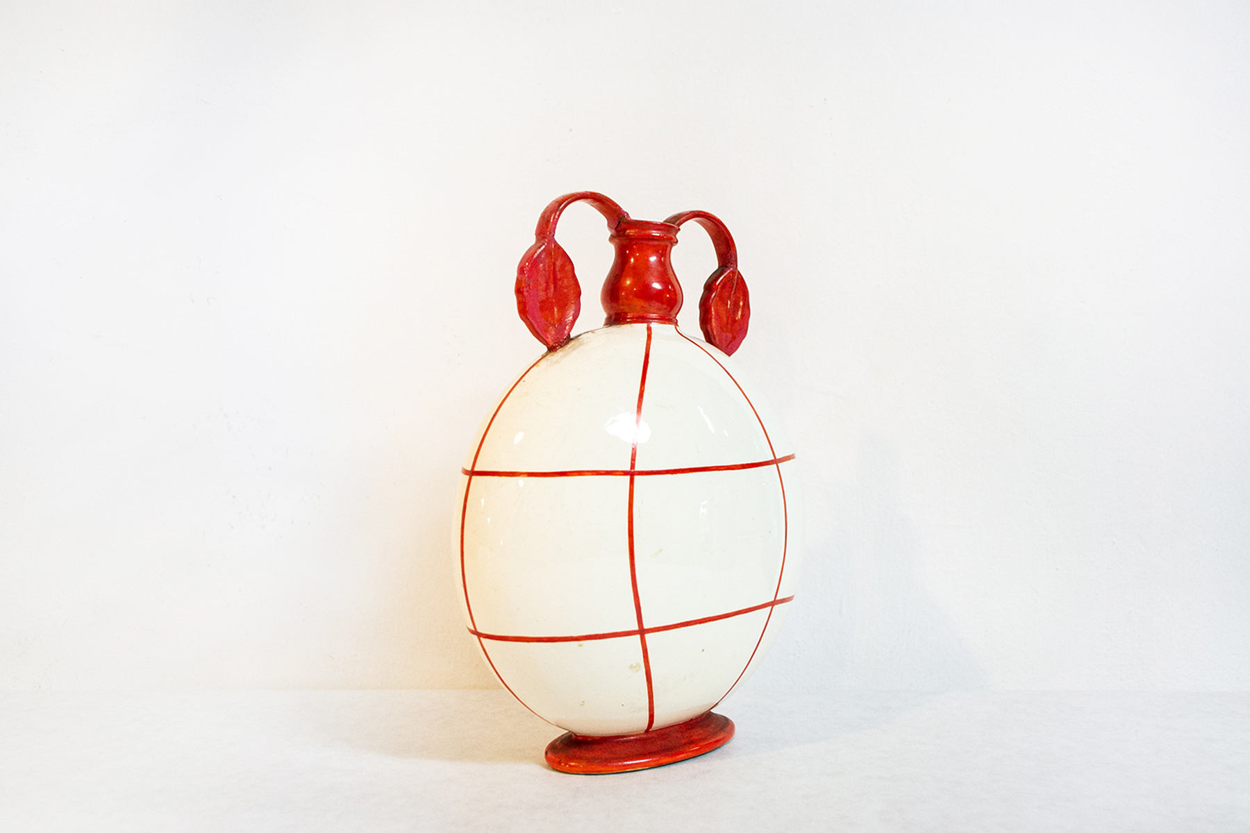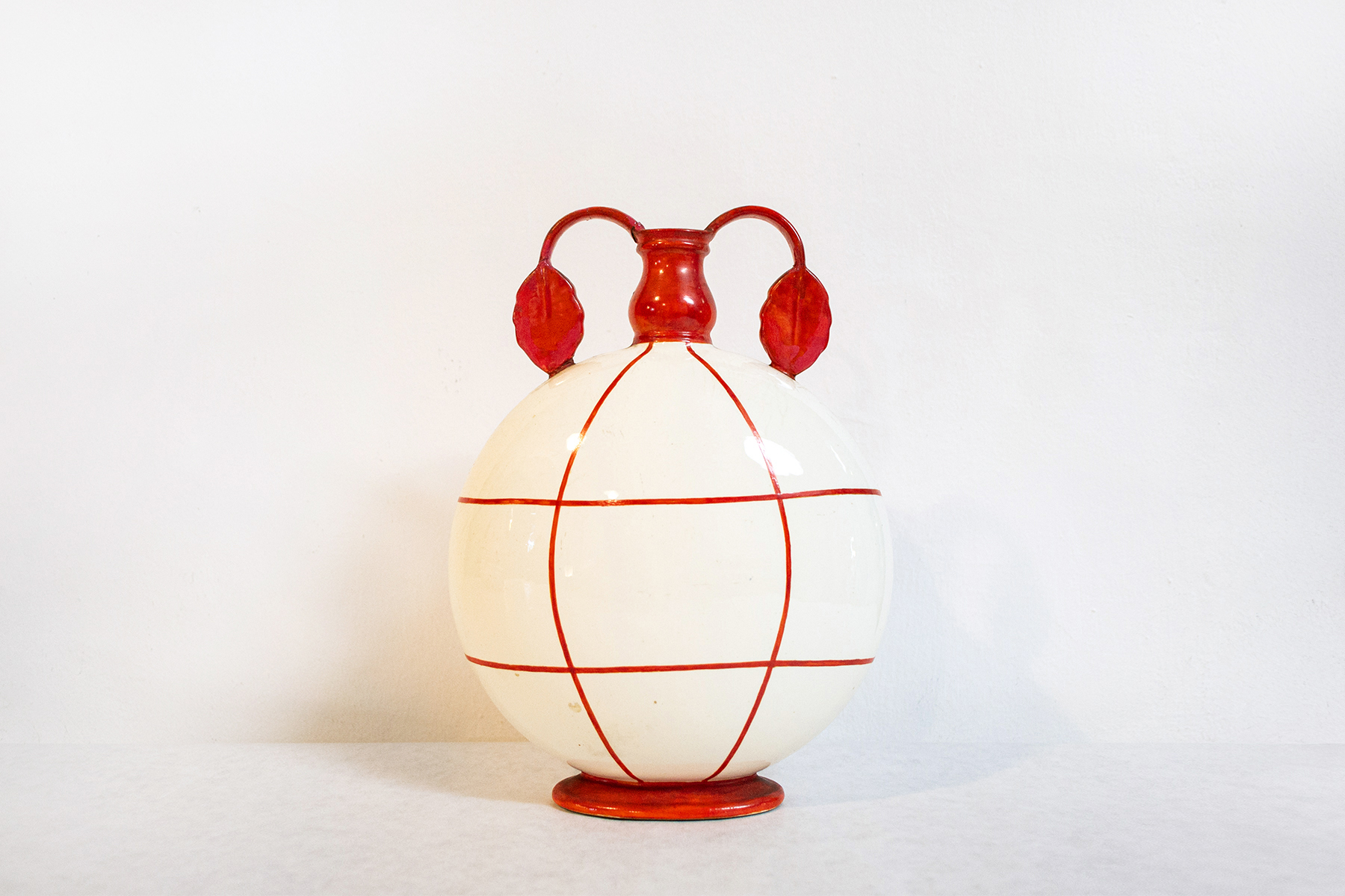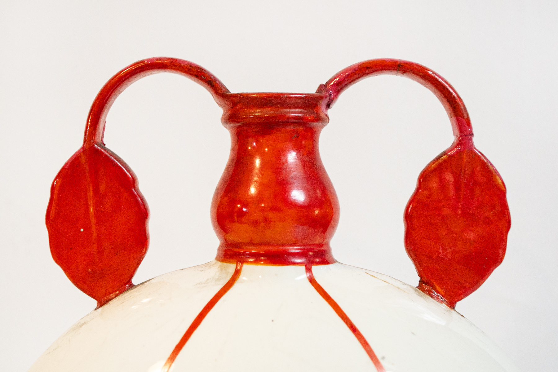 Vaso in ceramica a forma sferica con doppia ansa fitomorfa.