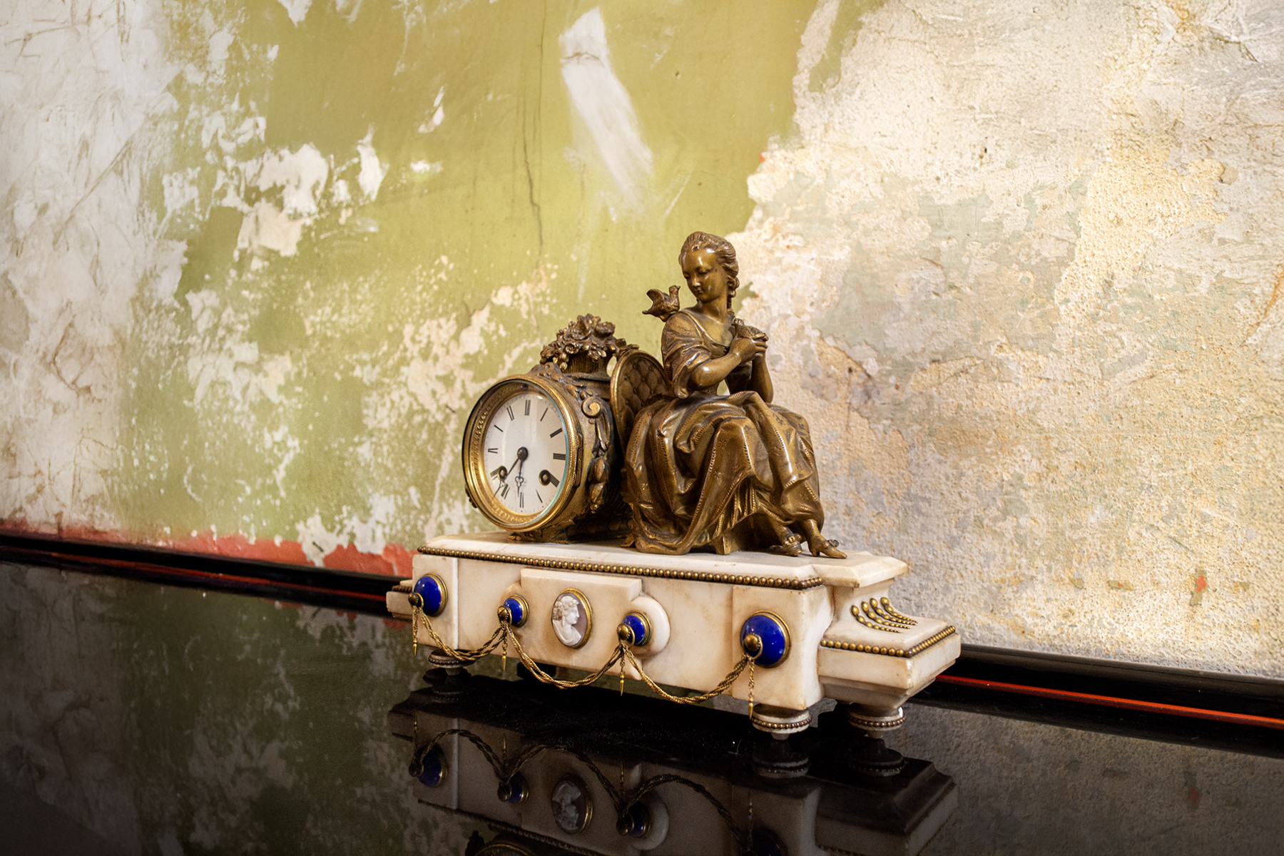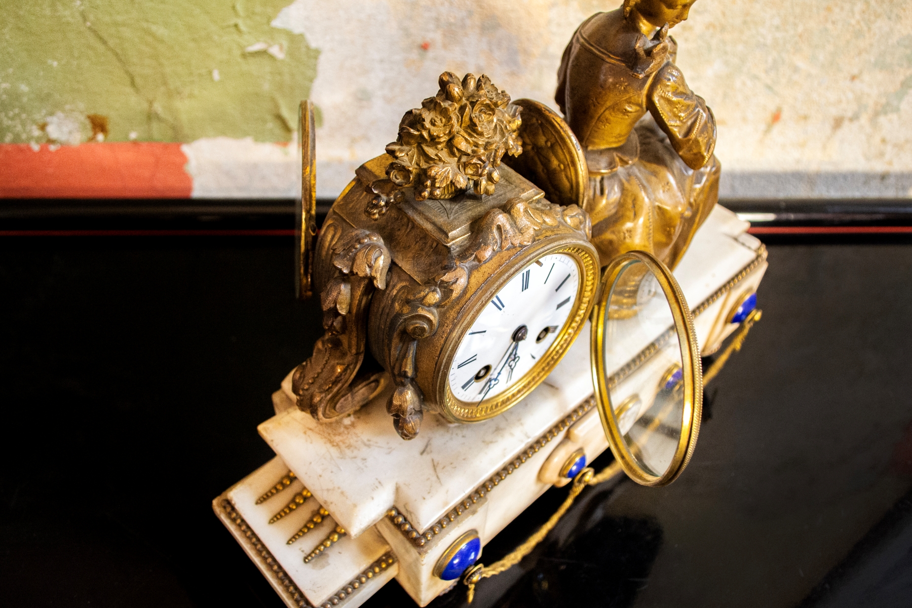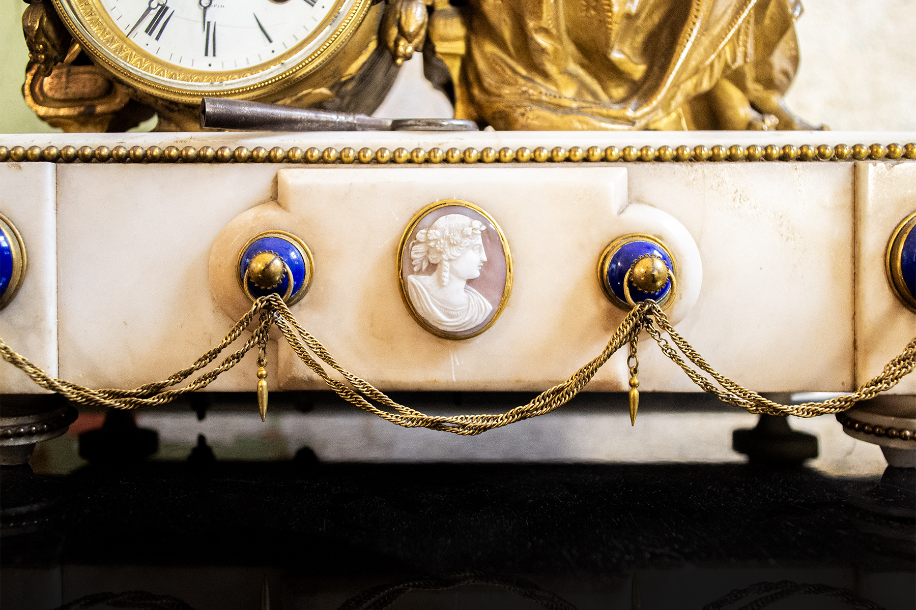 Orologio da camino in marmo e bronzo con cameo in conchiglia.