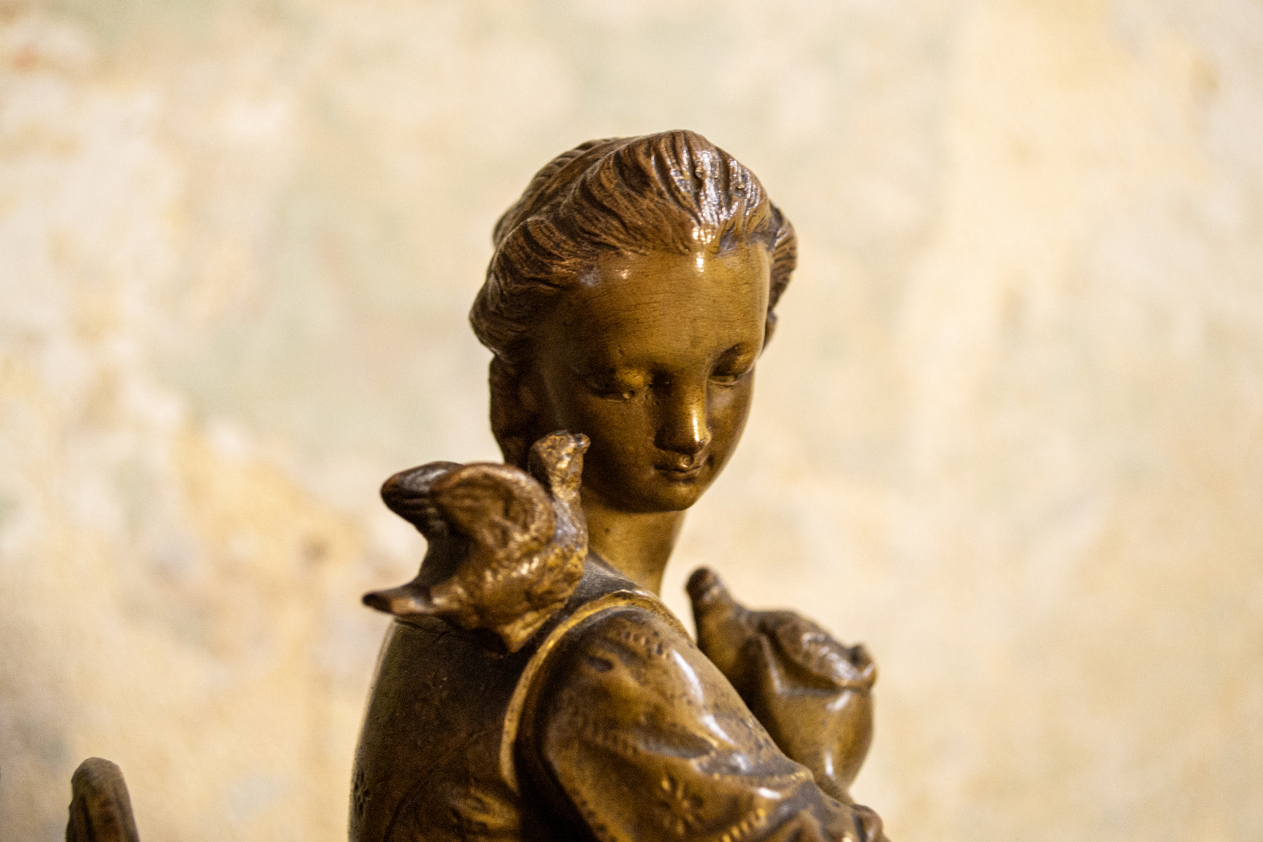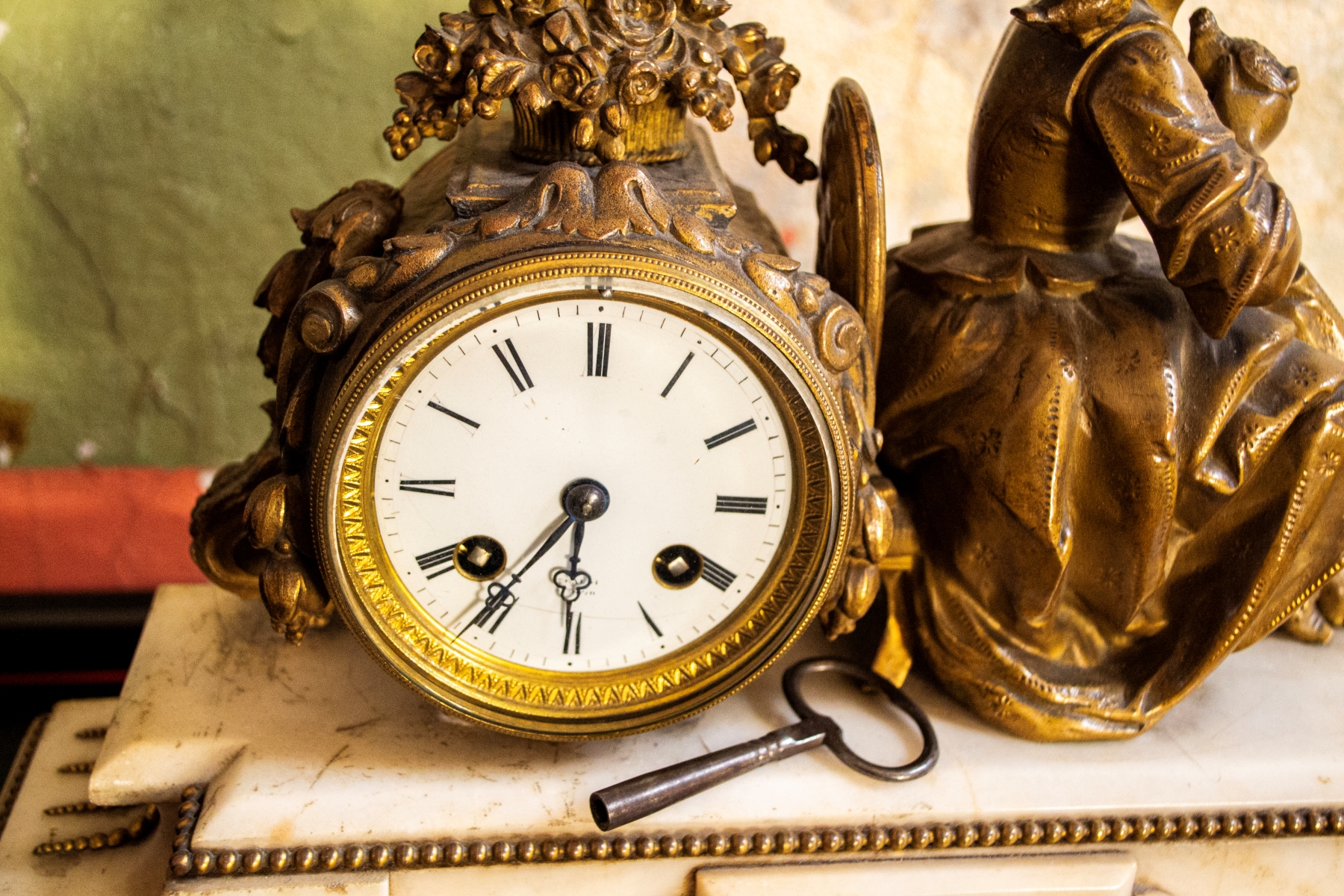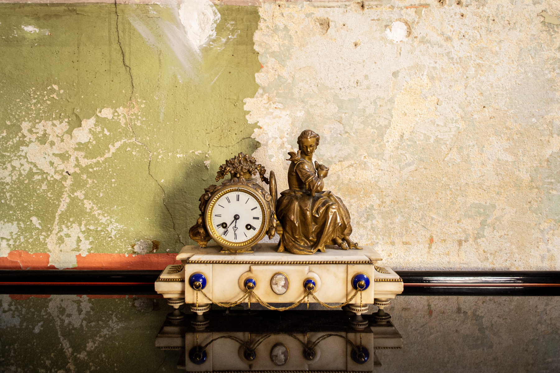 Orologio da camino in marmo e bronzo con cameo in conchiglia.