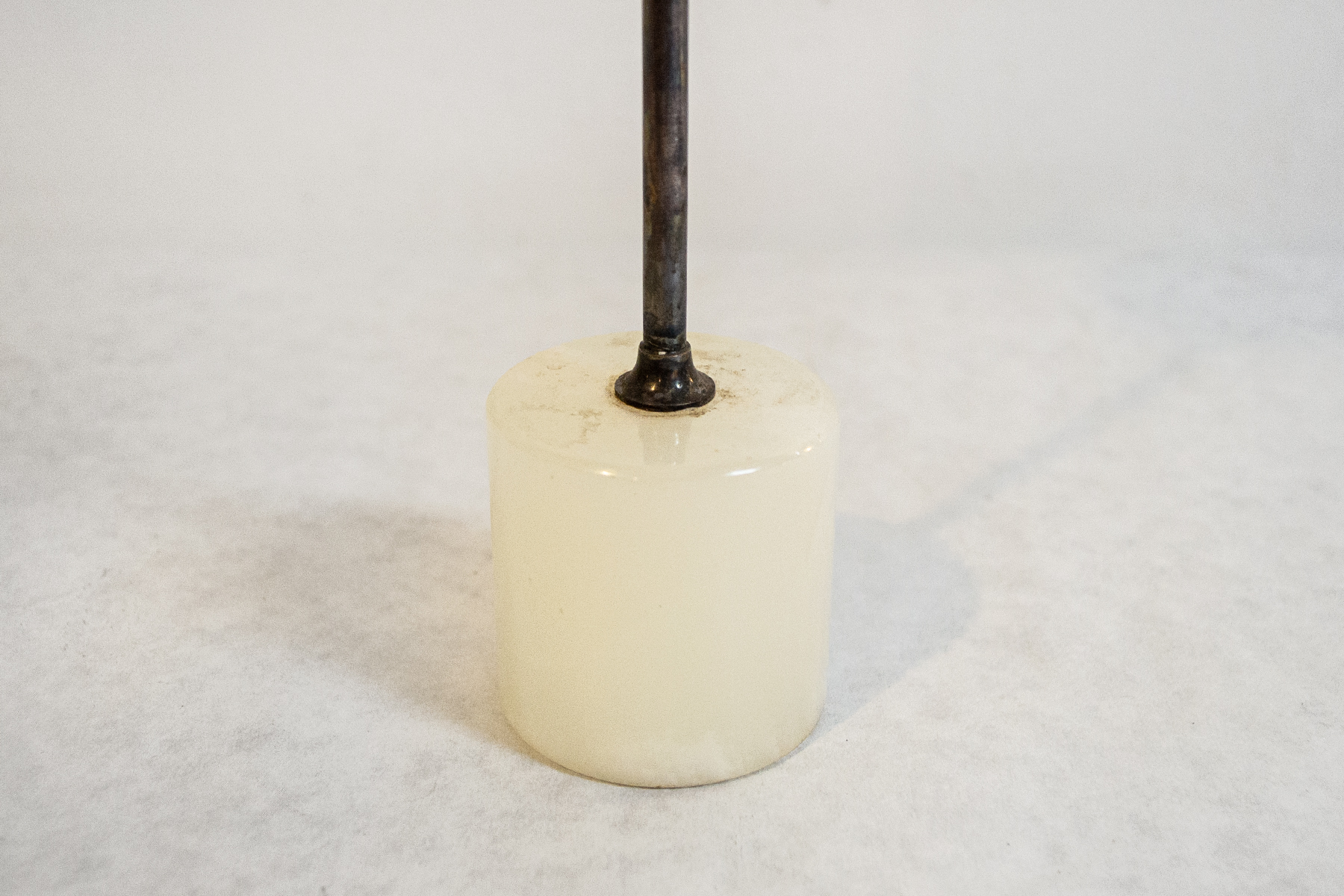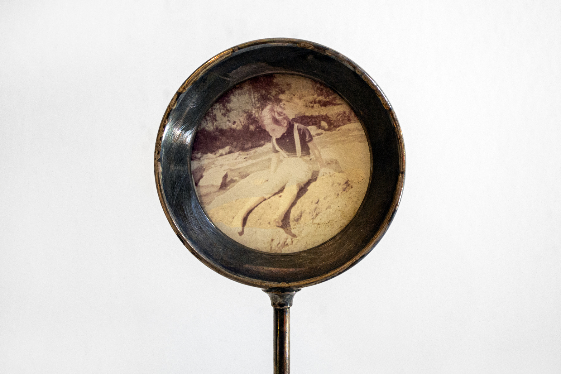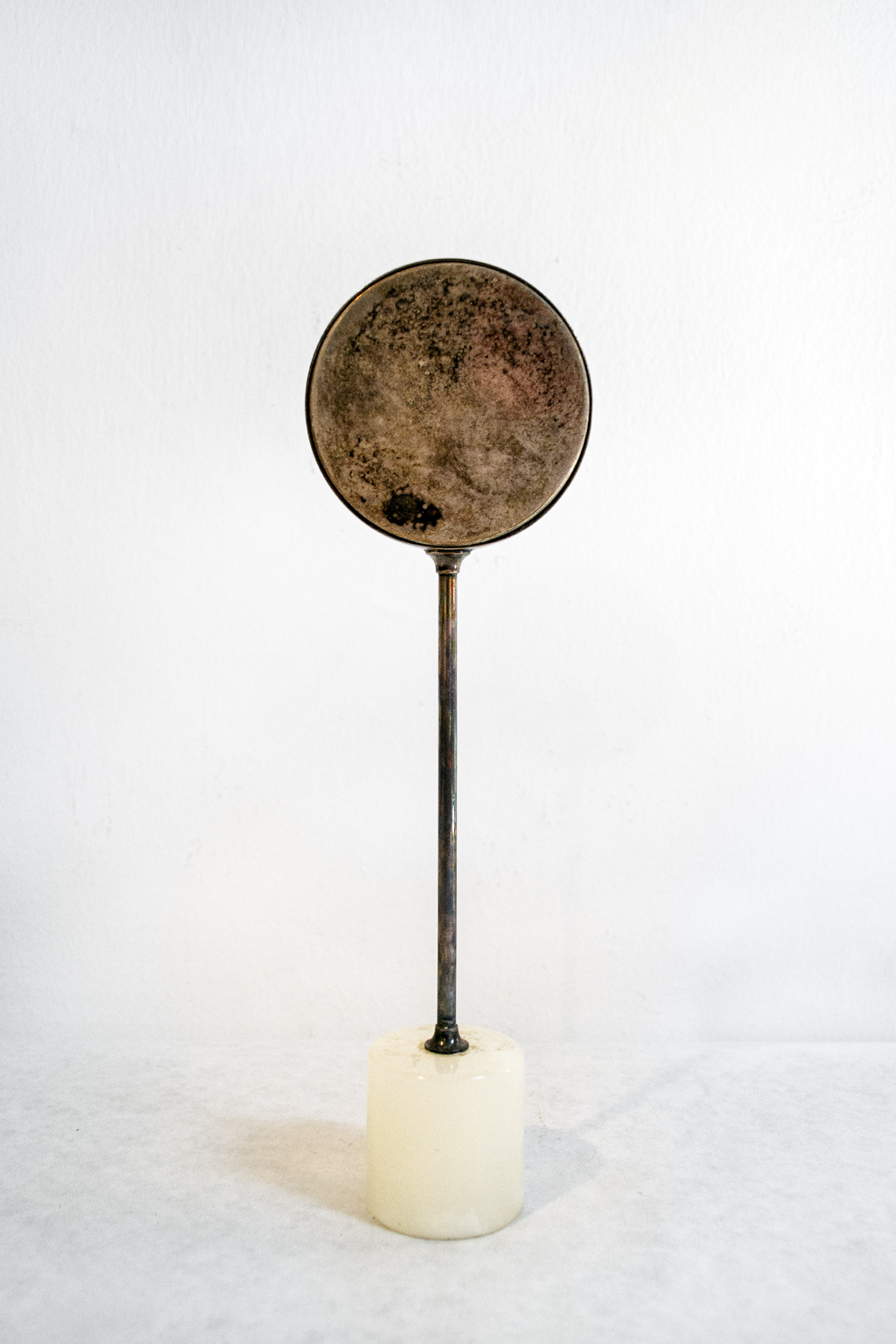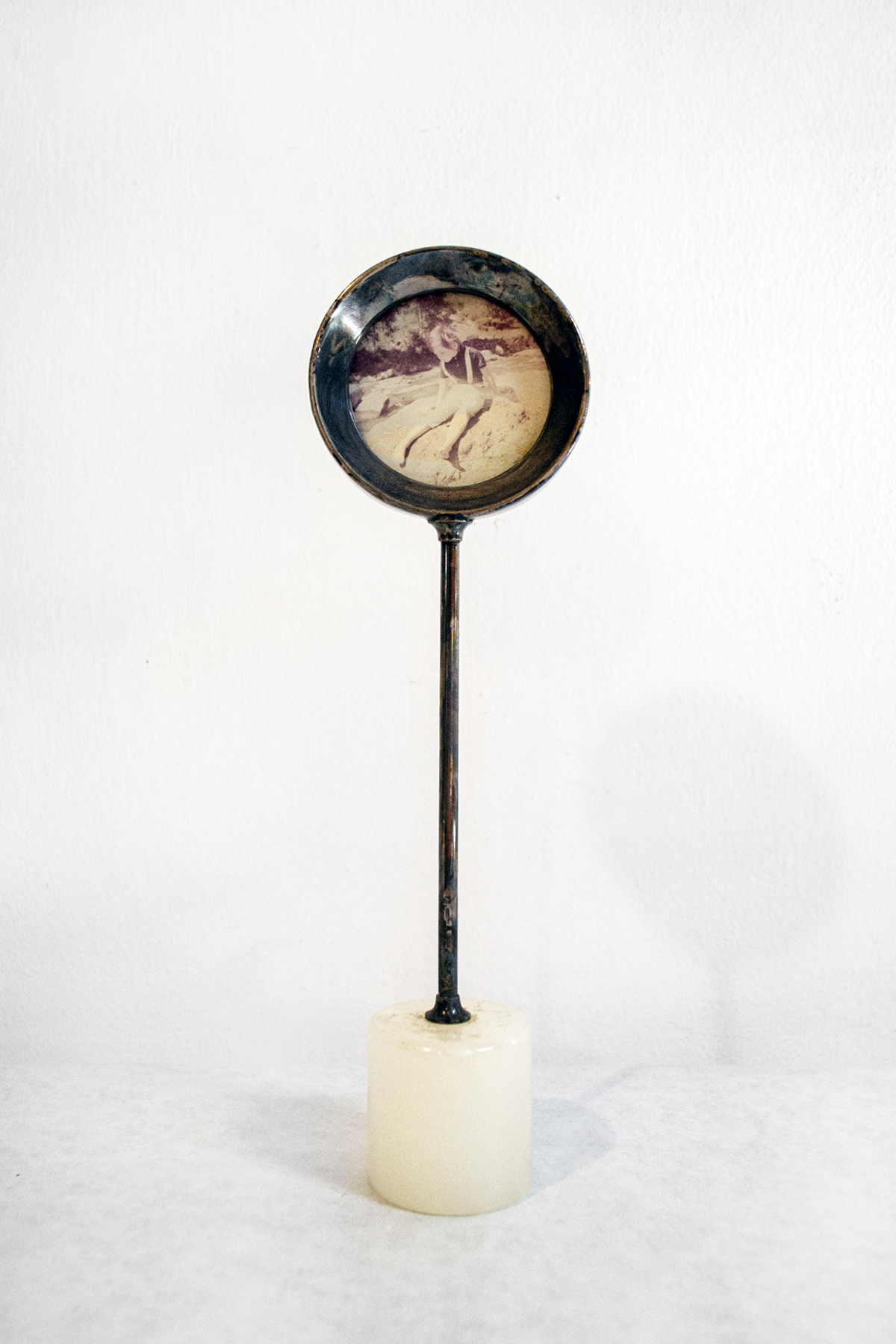 Portafoto in metallo argentato con base in pietra.
