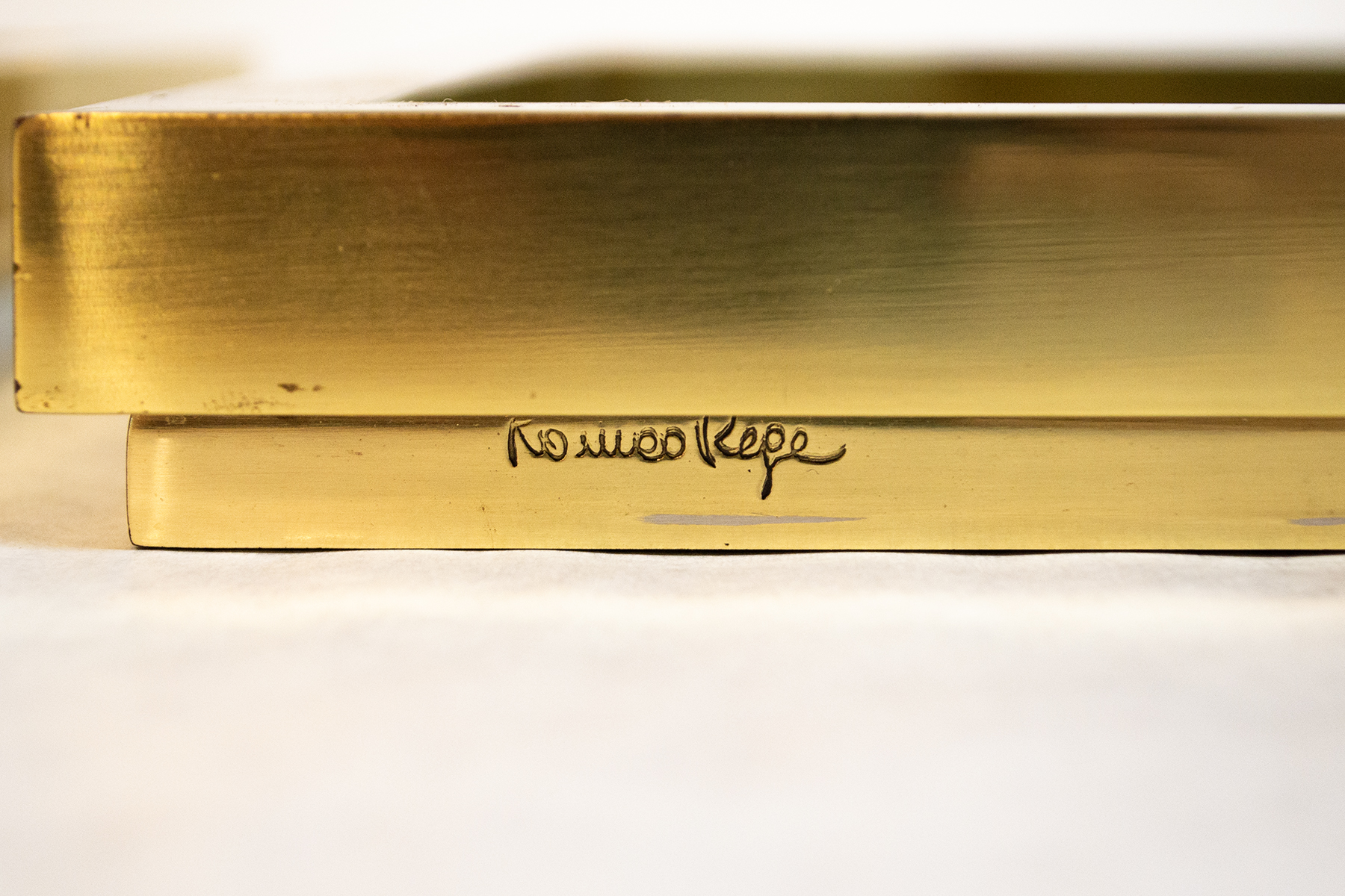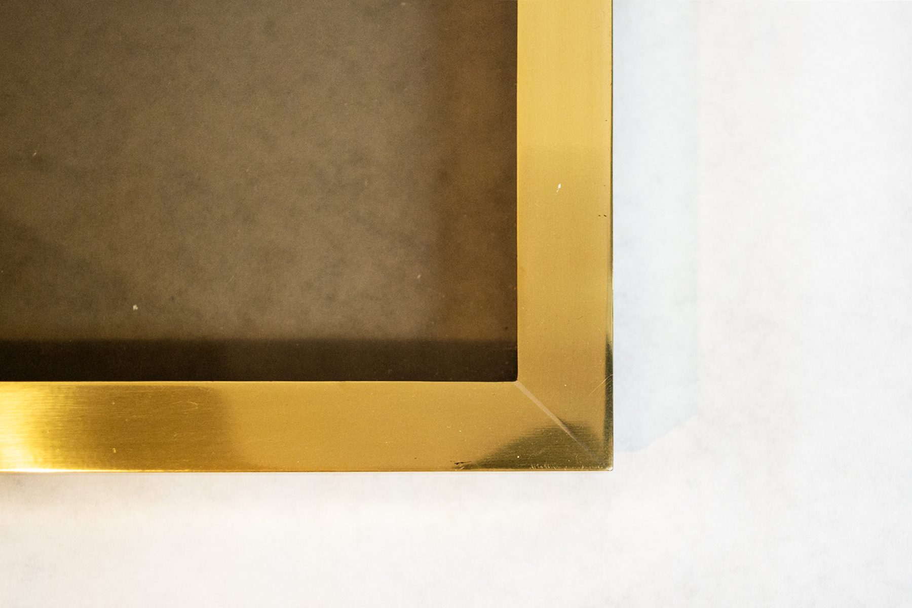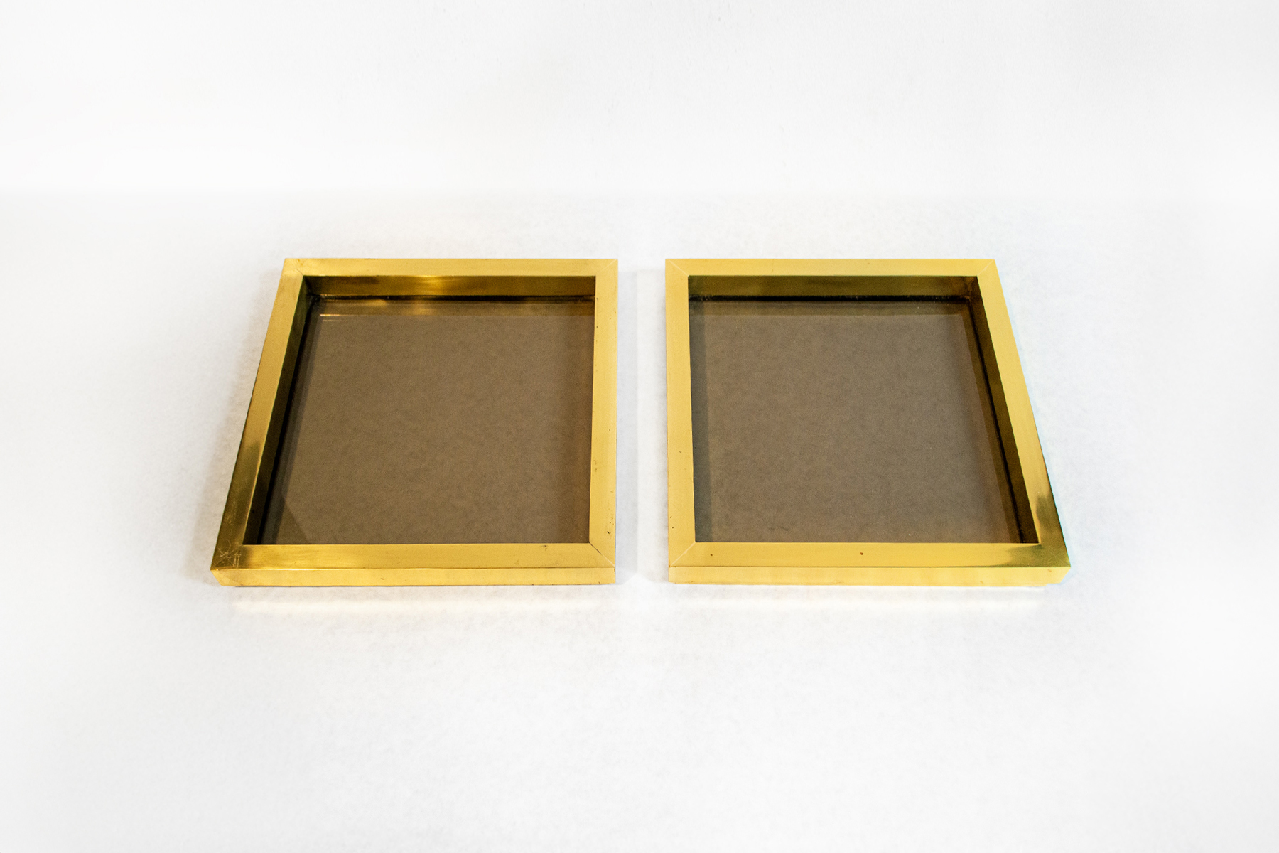 Coppia di svuotatasche con cornice in ottone e base in vetro fumé.