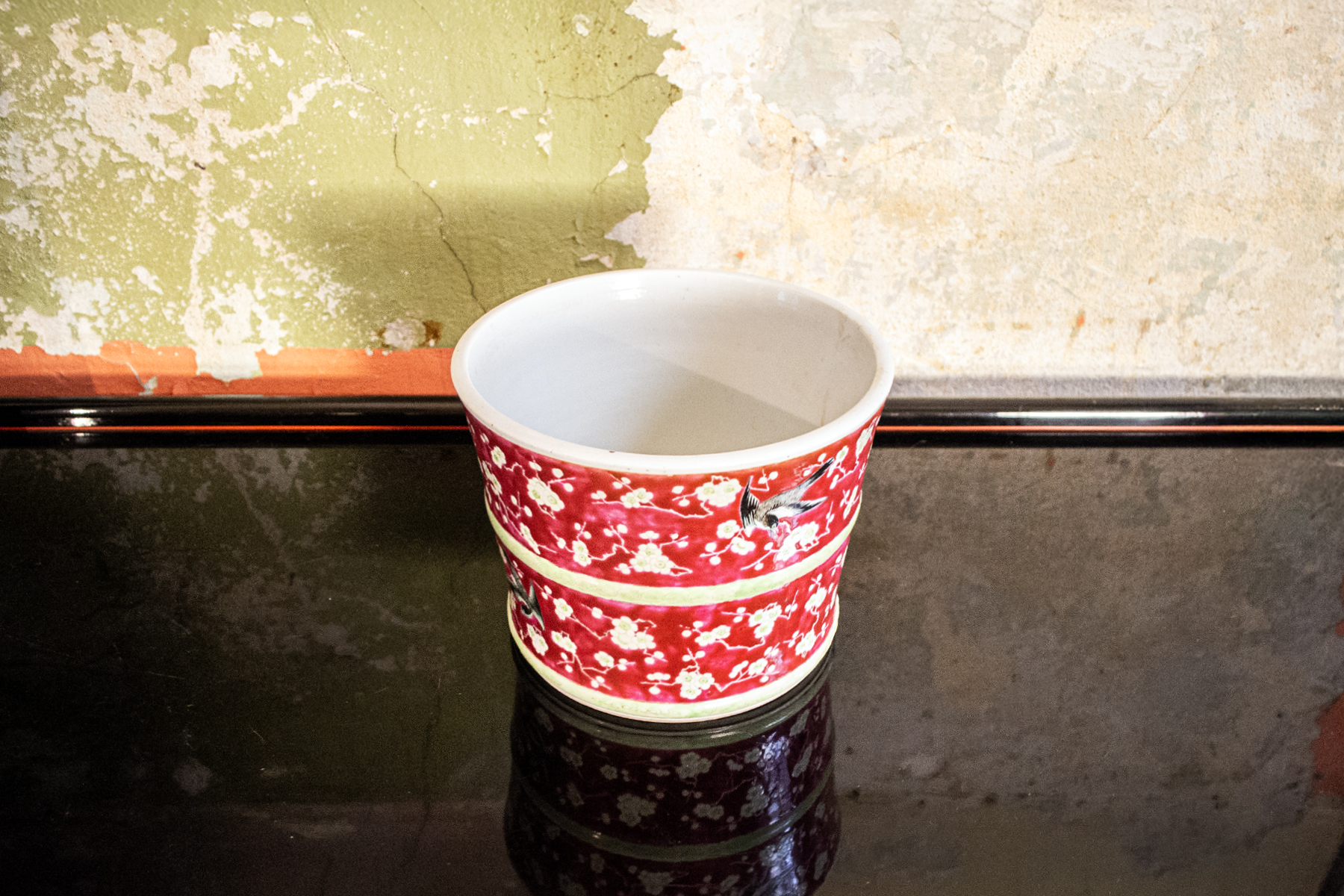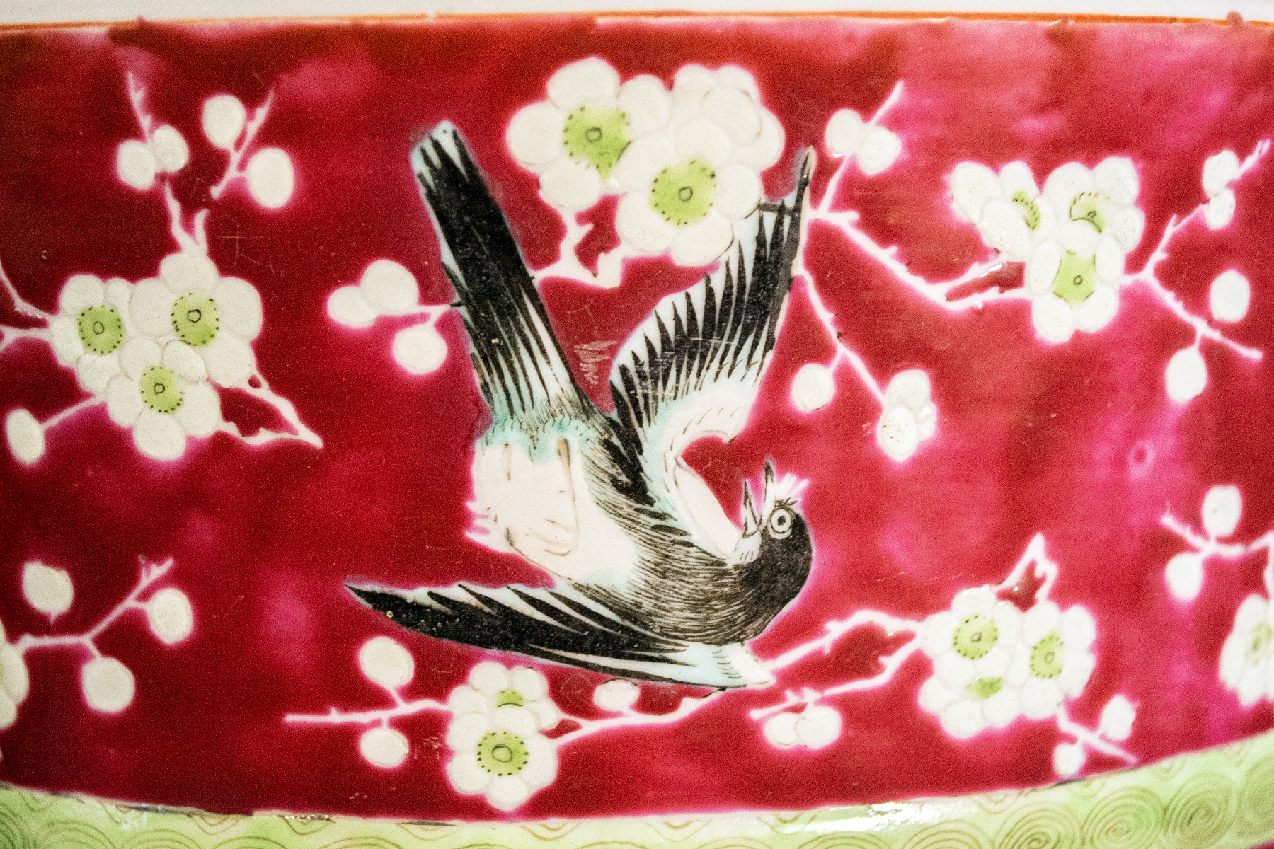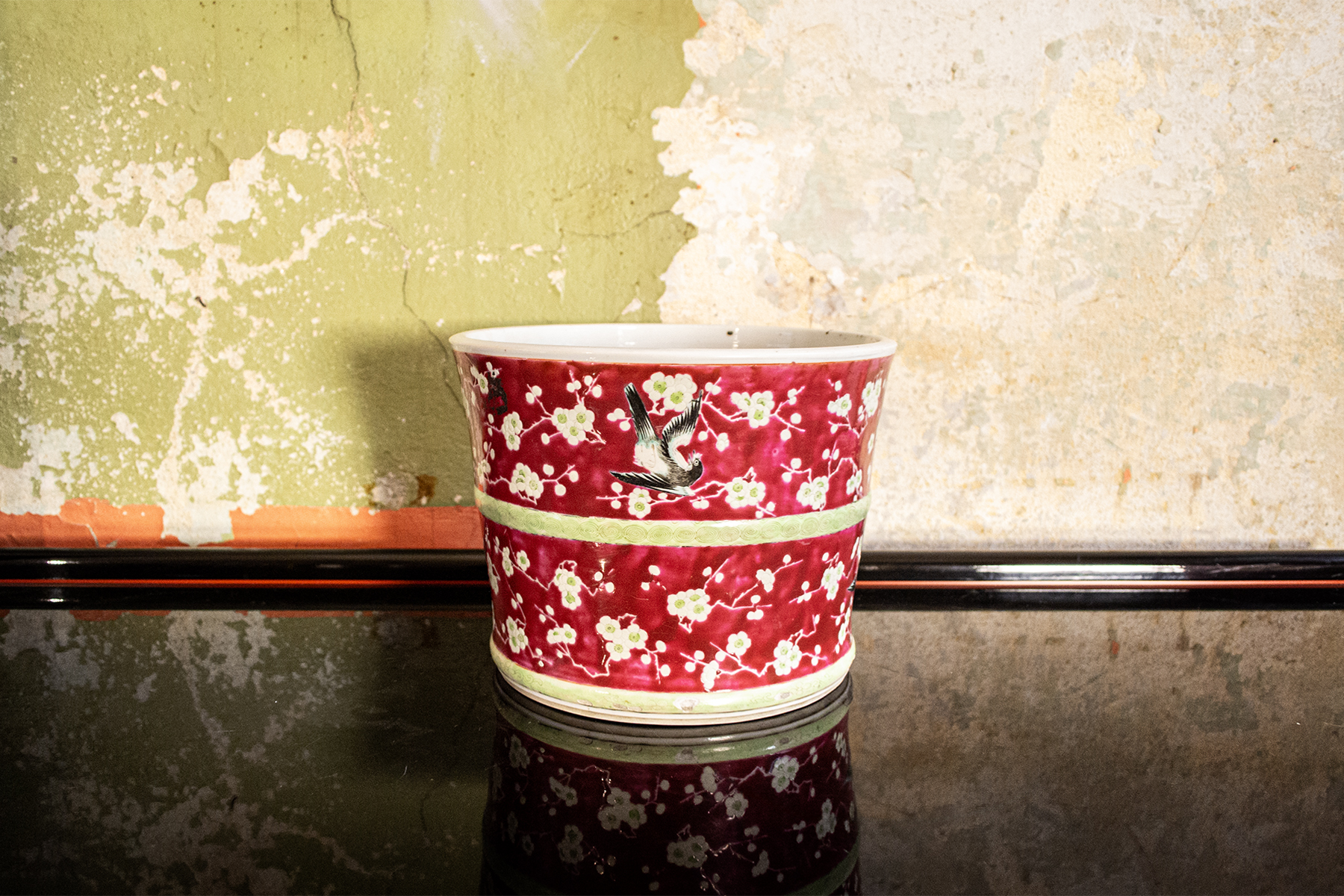 Antico vaso cinese in porcellana con fiori di pruno e uccelli.