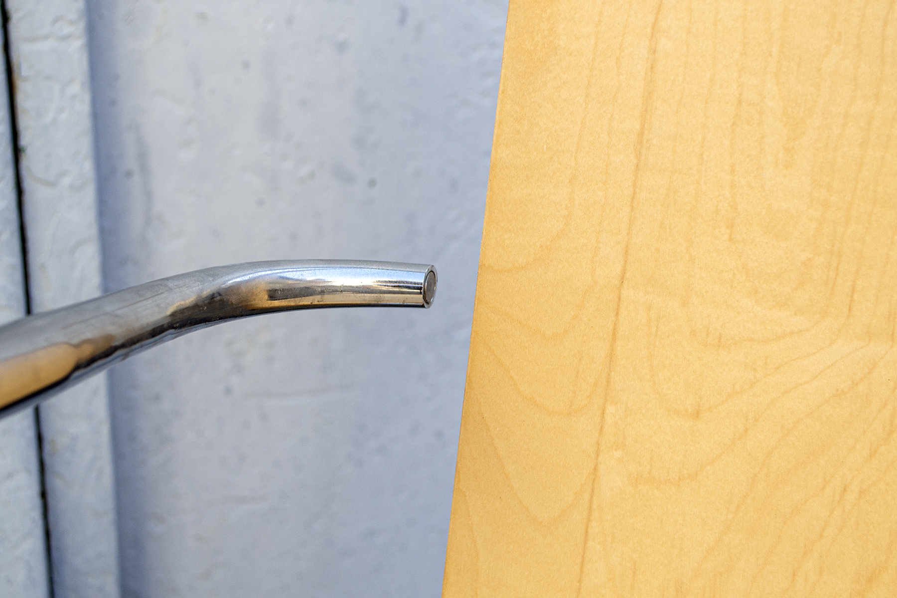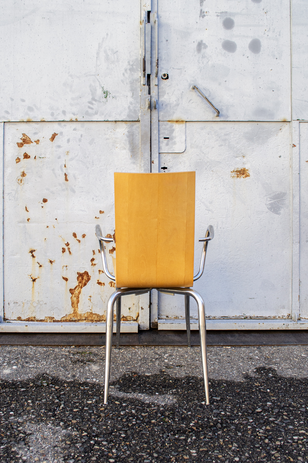 Poltroncina con struttura in tubolare metallico cromato, seduta in multistrato impiallacciato in acero.