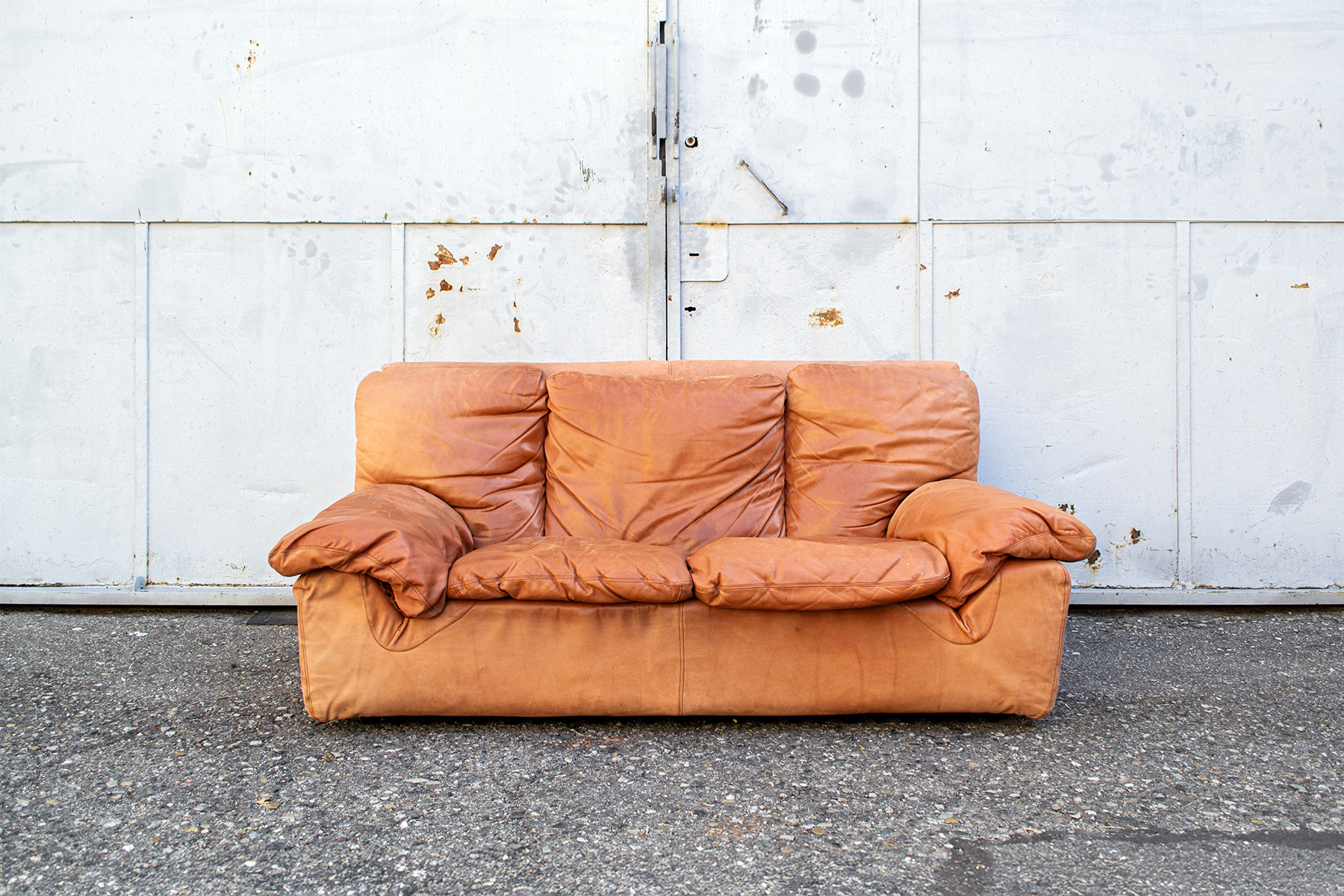 Divano con imbottitura rivestita in pelle e basamento in plastica.