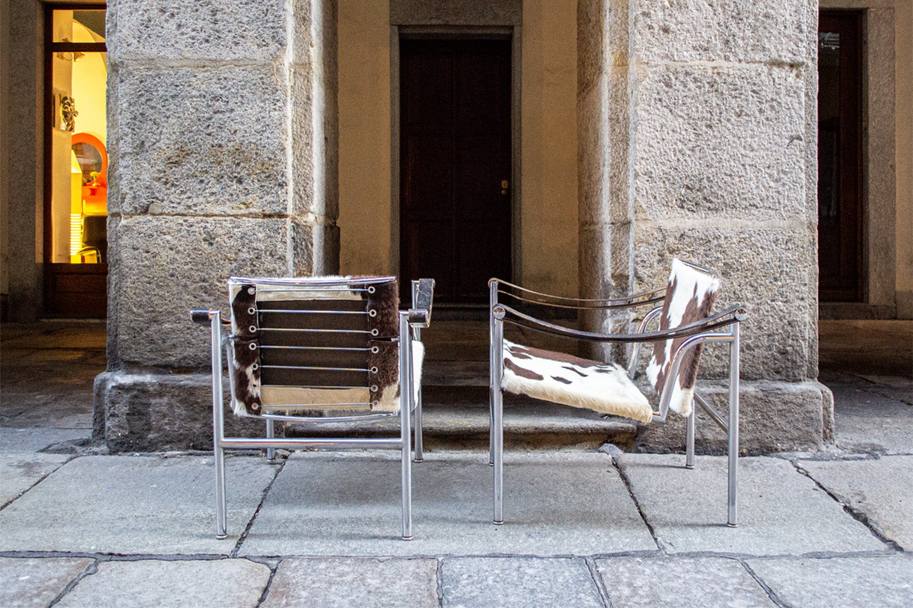 Poltroncine con struttura in metallo cromato, seduta e schienale in pelliccia.