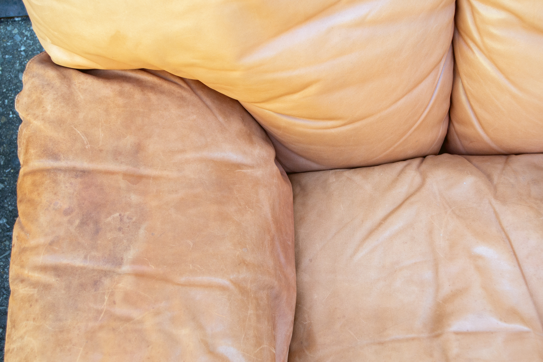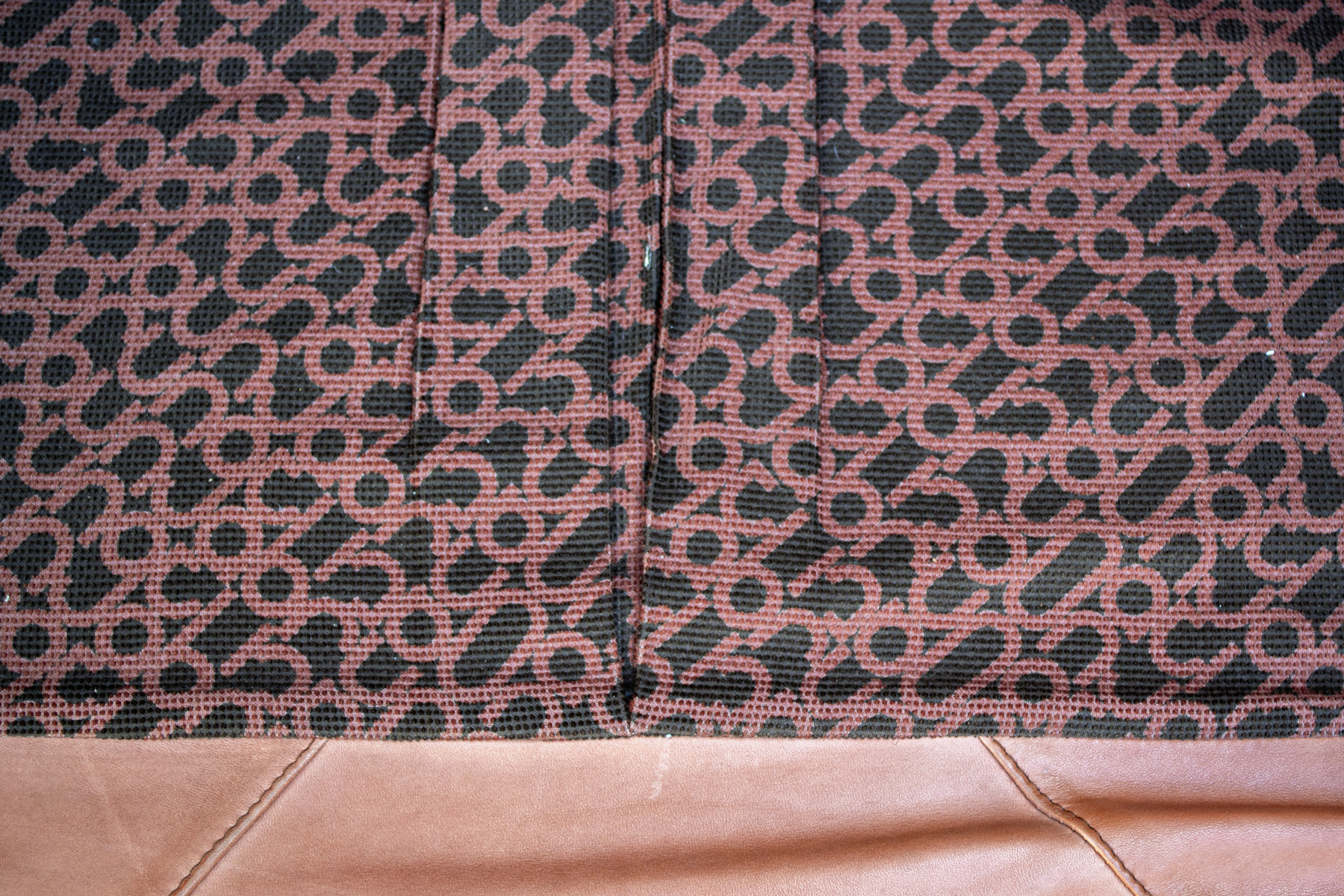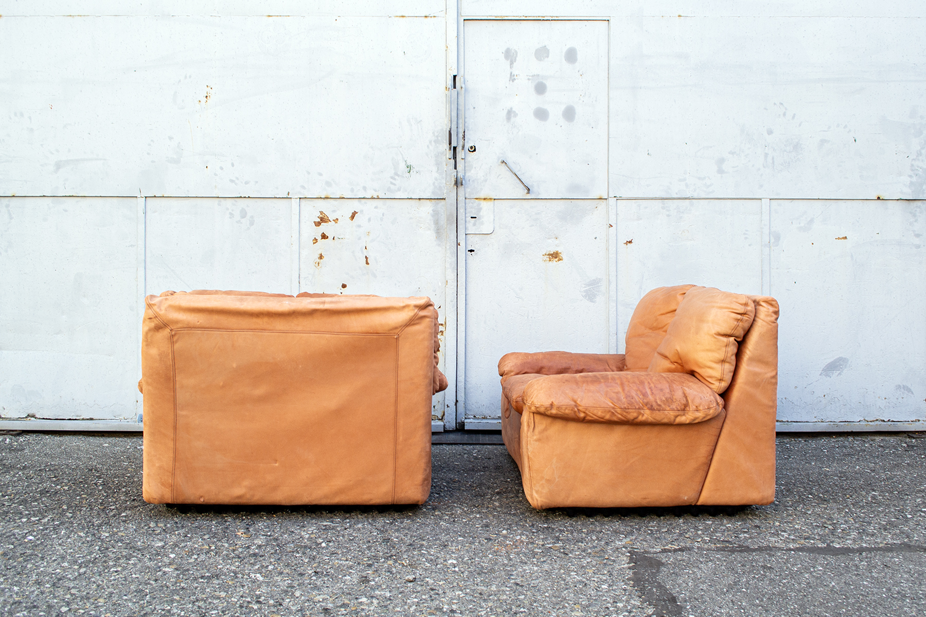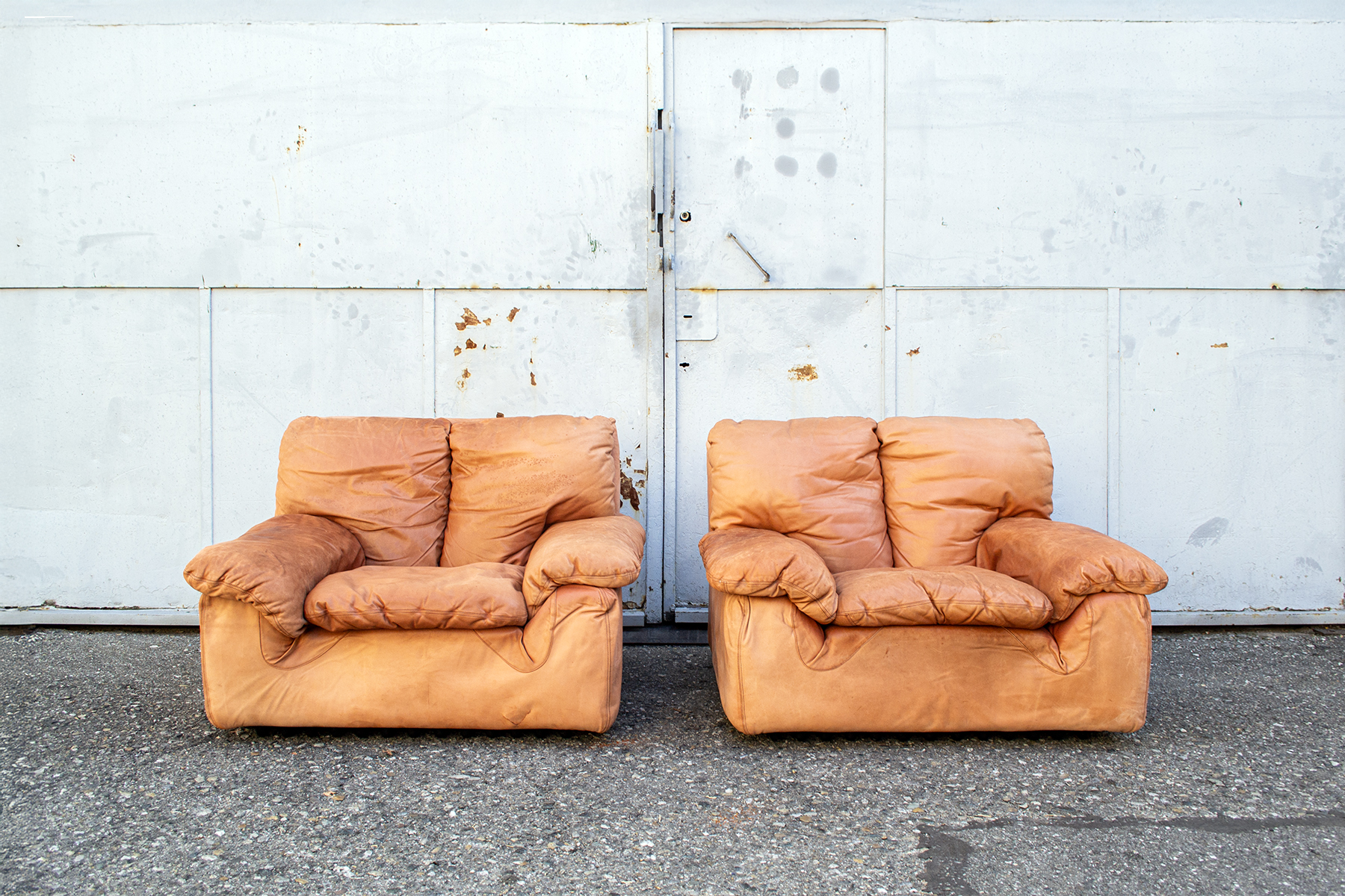 Coppia di poltrone con imbottitura rivestita in pelle e basamento in plastica.