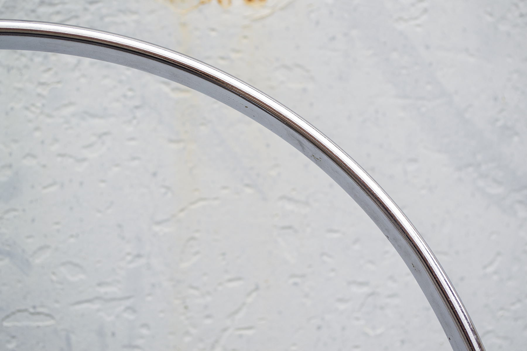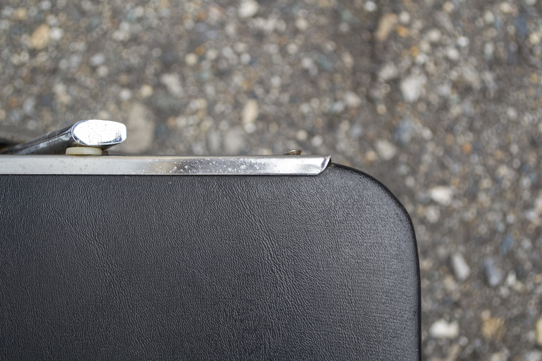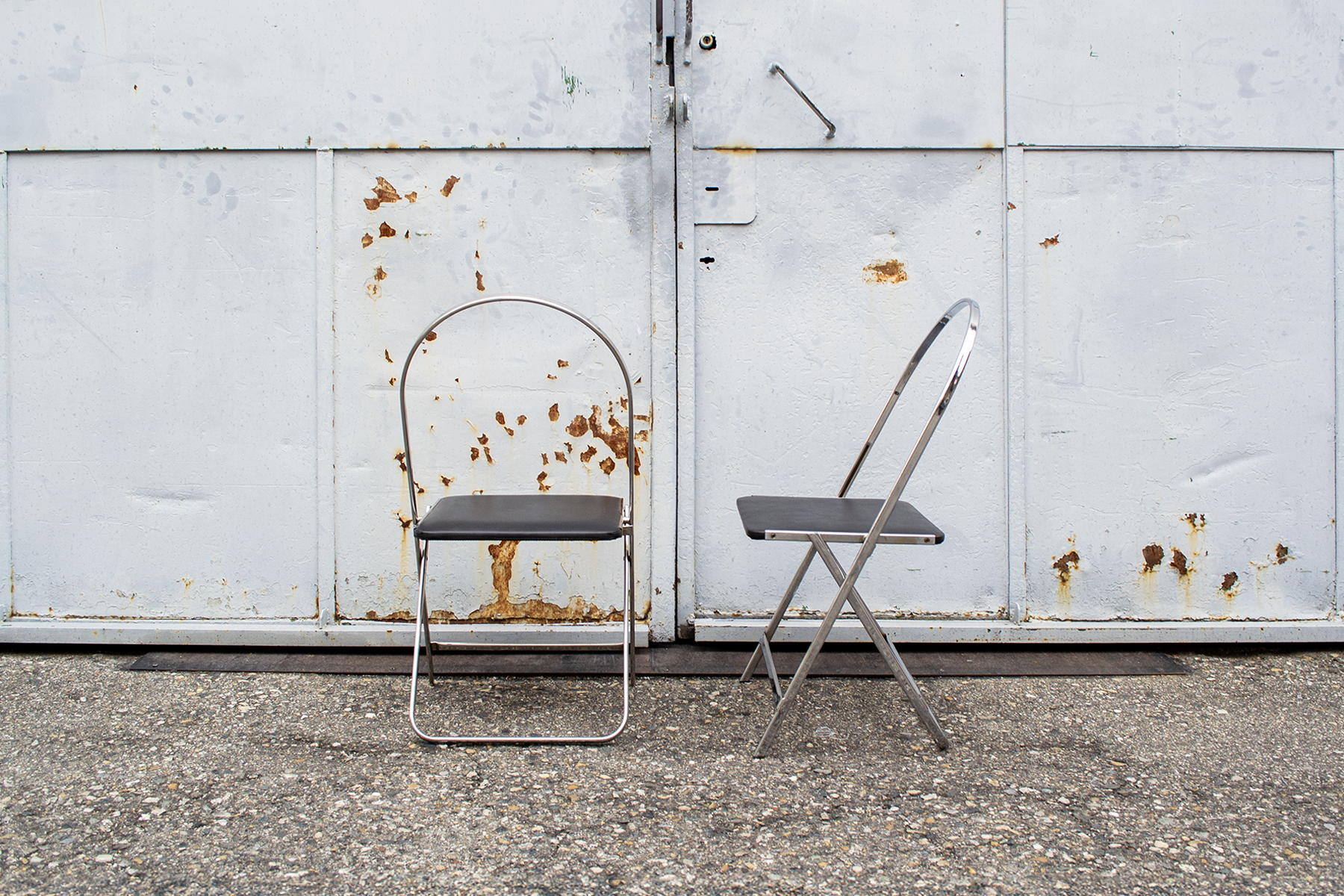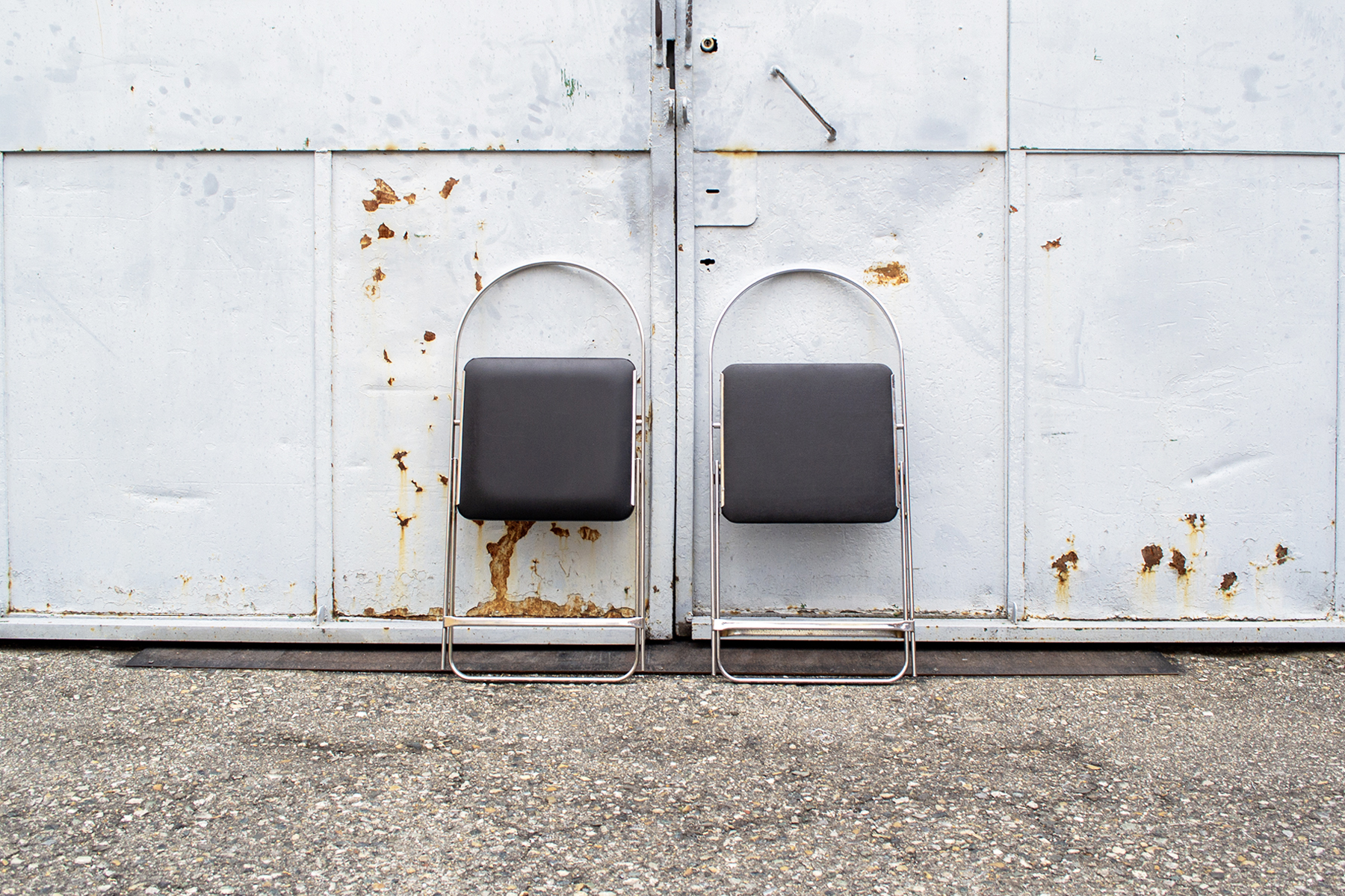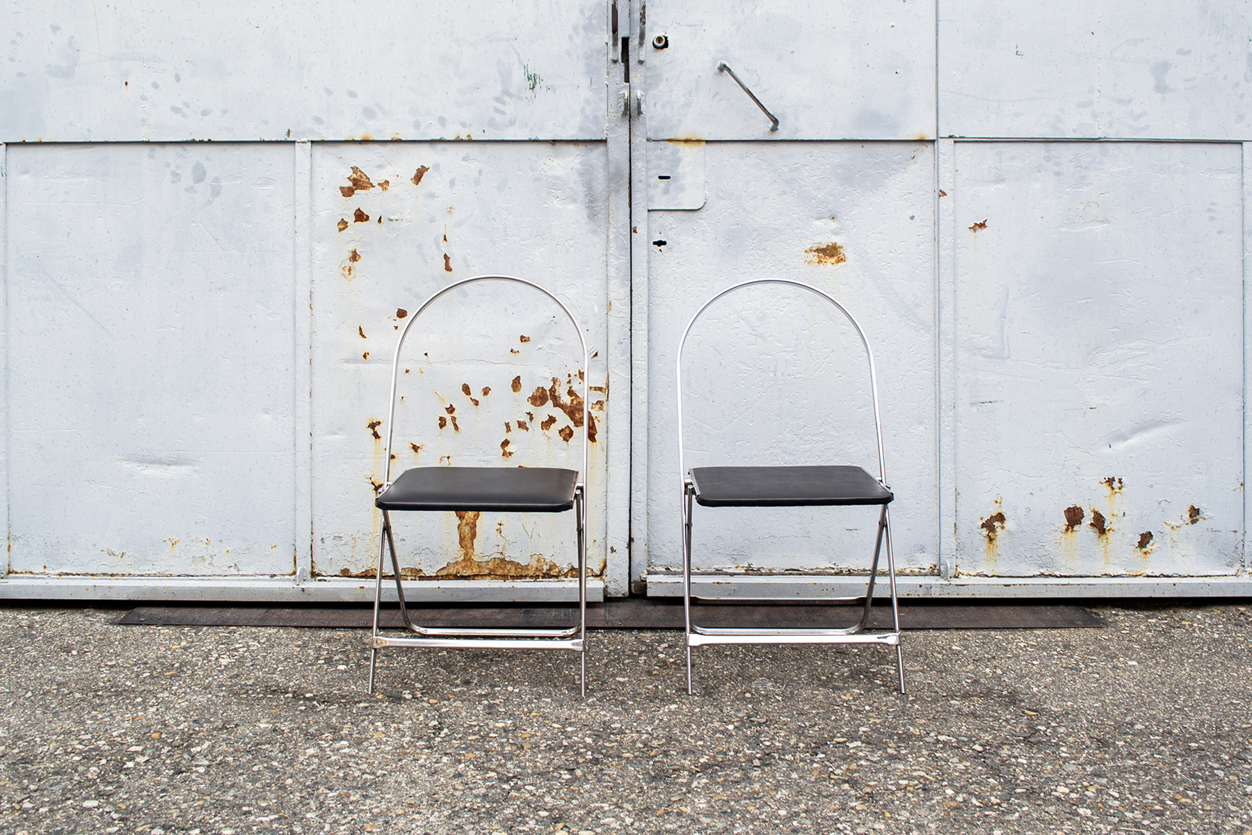 Sedie pieghevoli con struttura in metallo e seduta in cuoio.