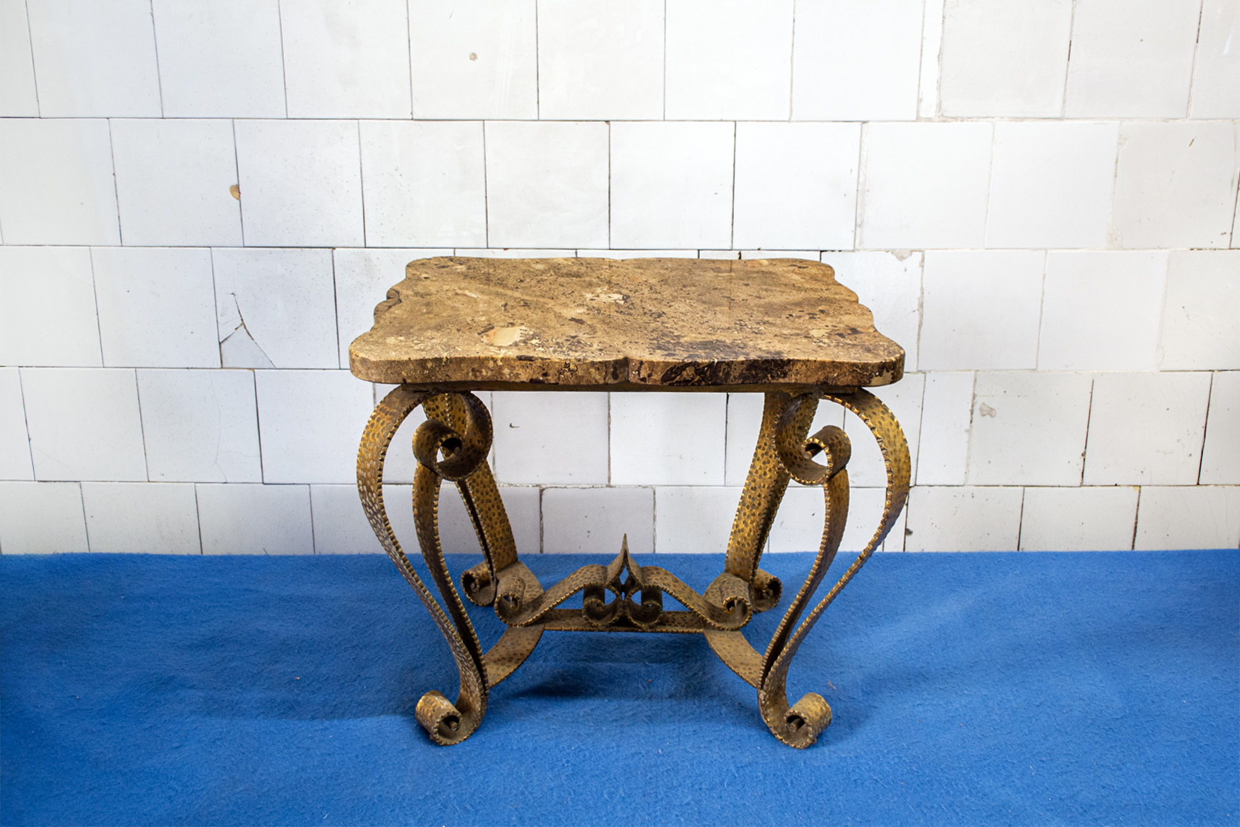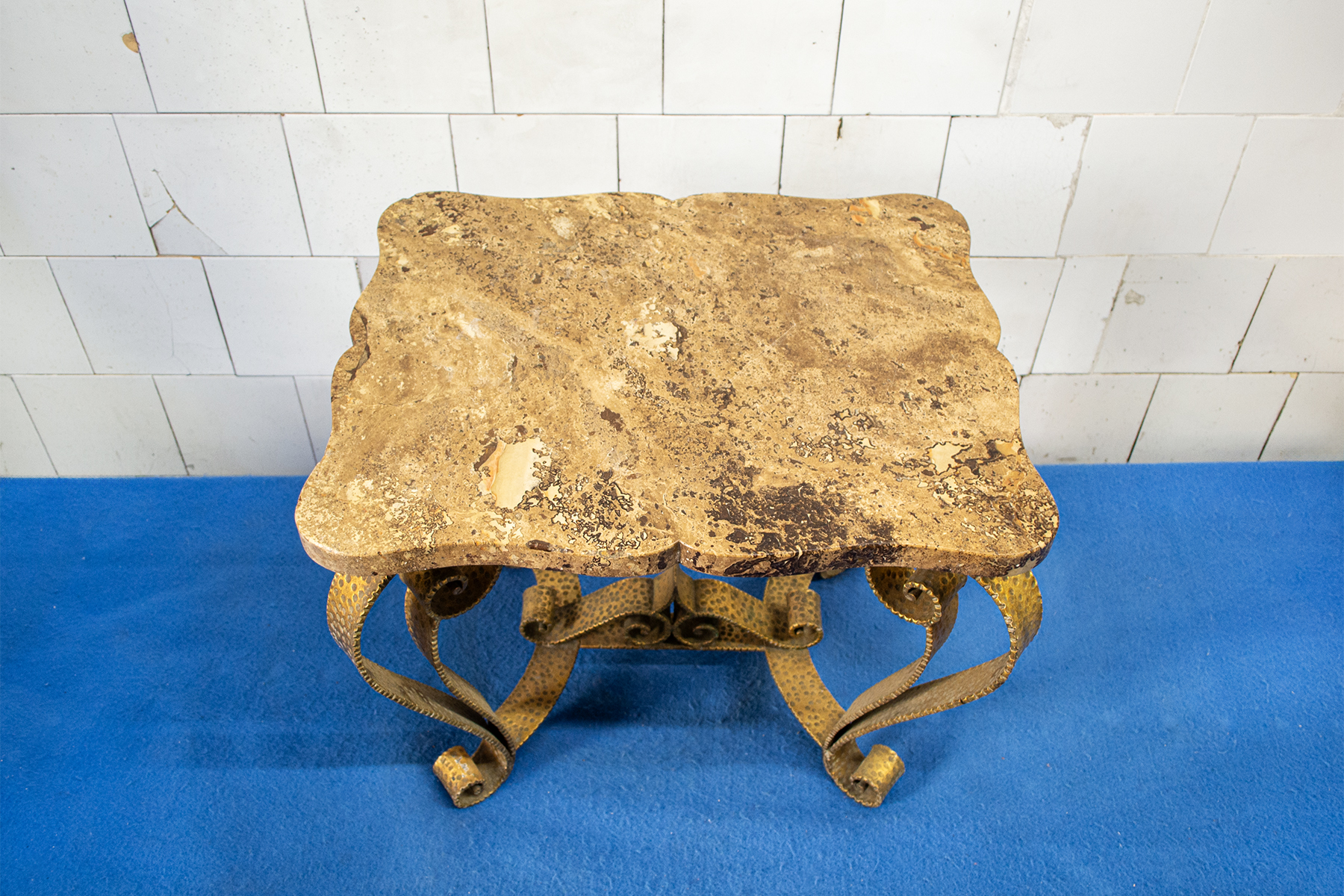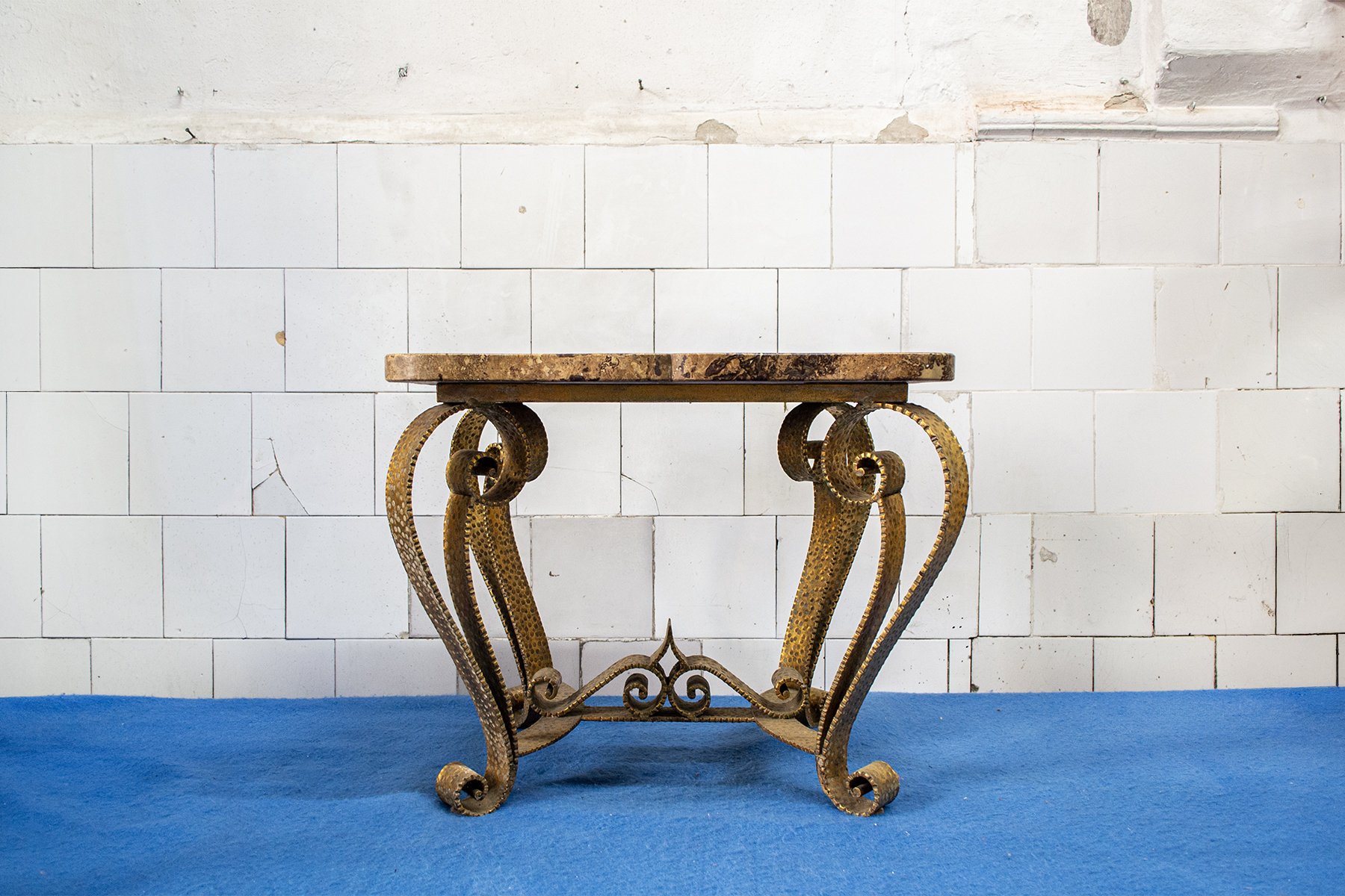 Tavolino con struttura in ferro dorato e piano in marmo.