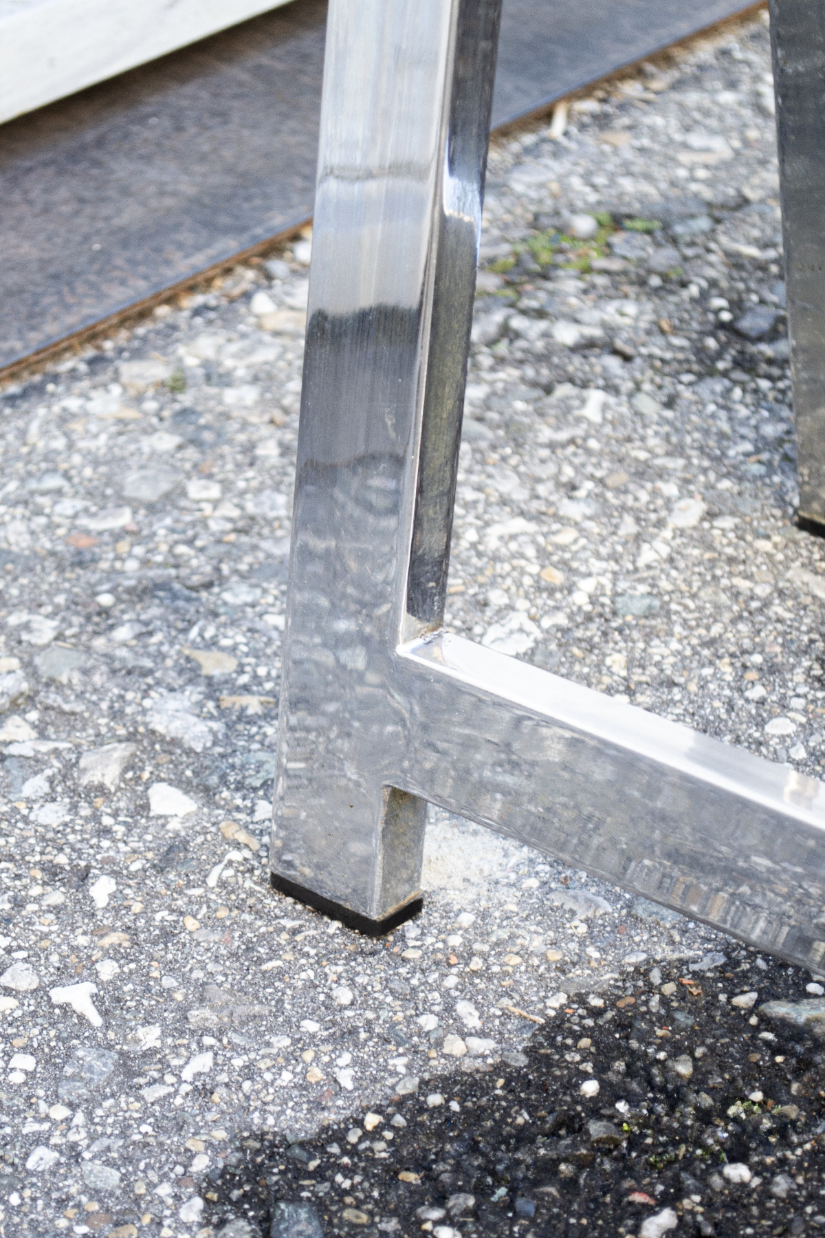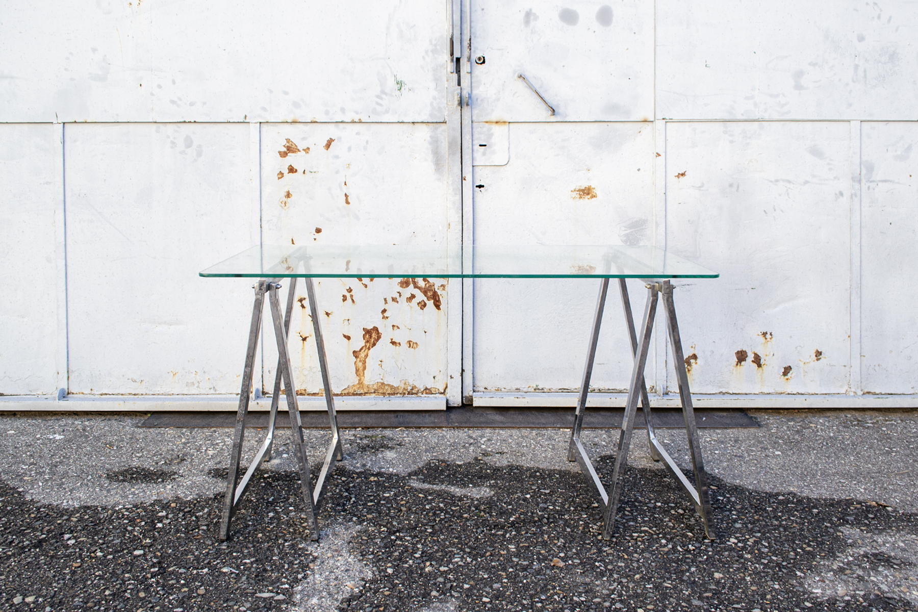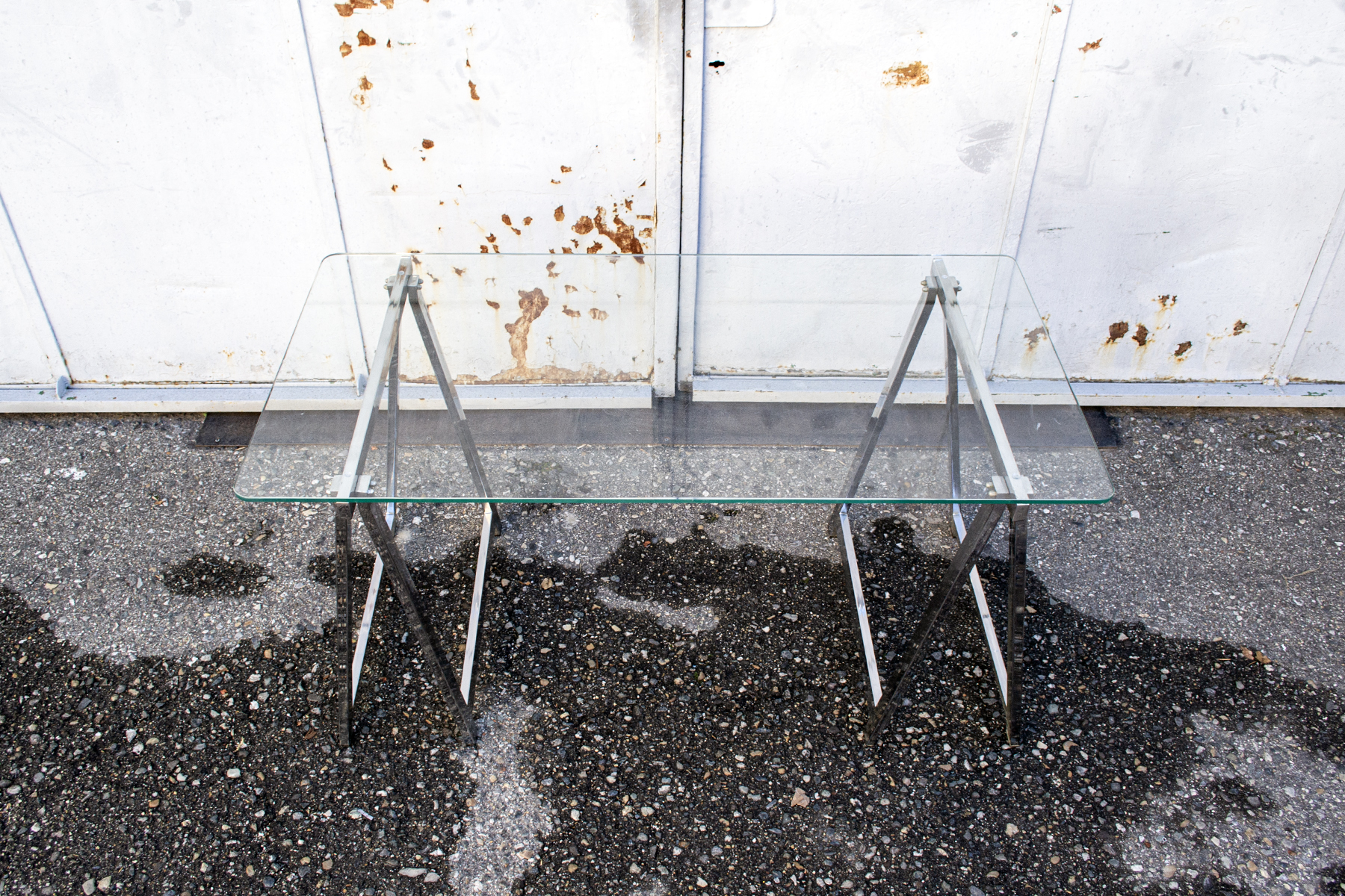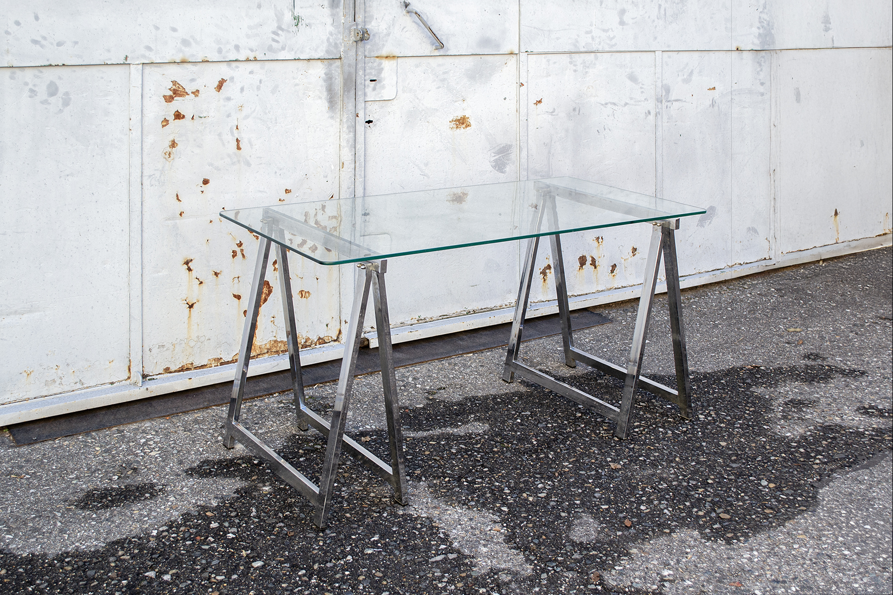 Tavolo con struttura a cavalletti in acciaio cromato e piano in vetro.