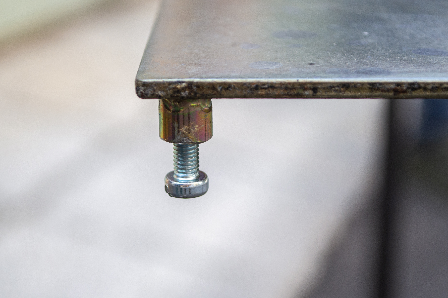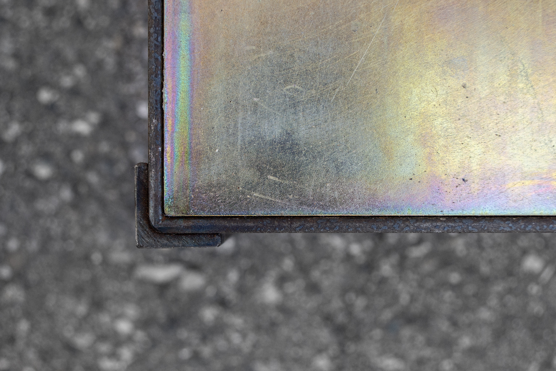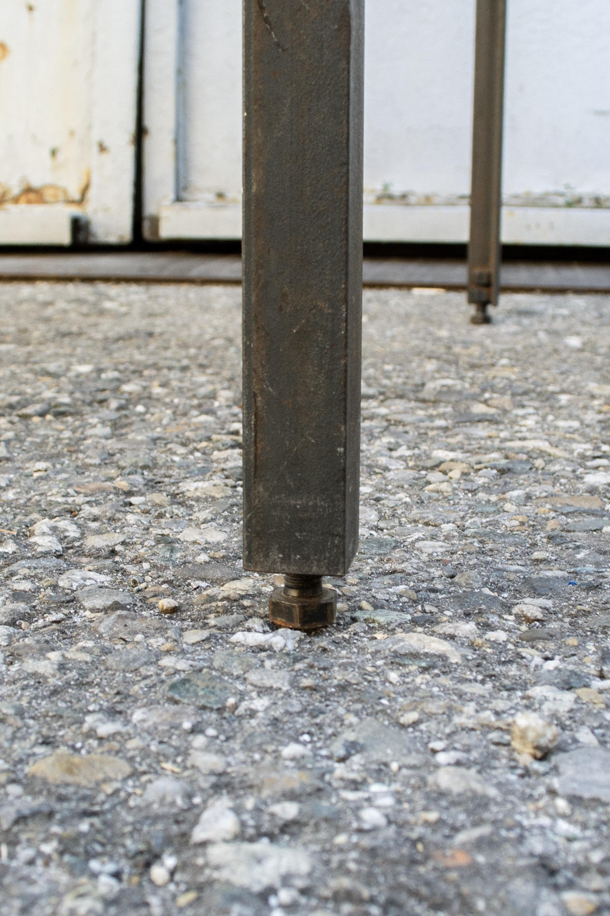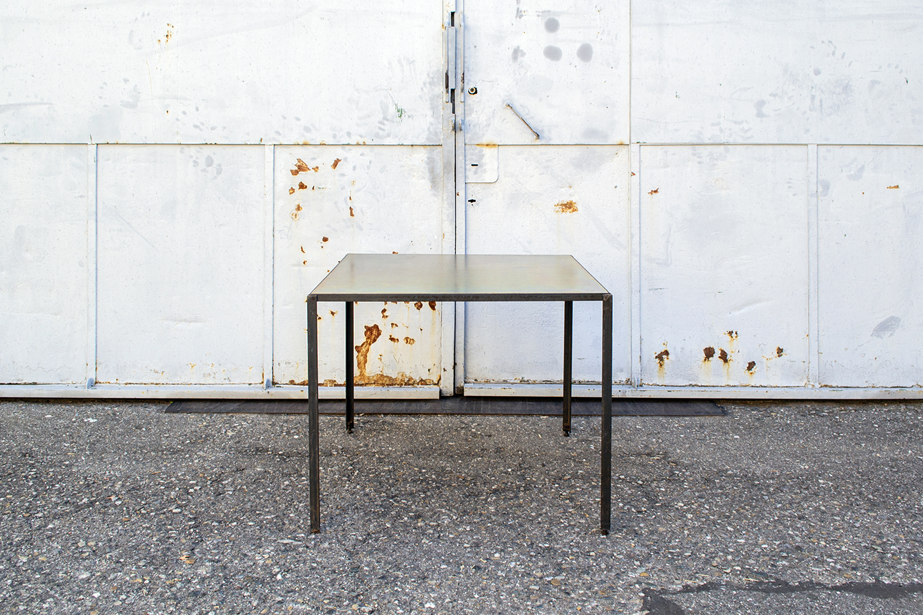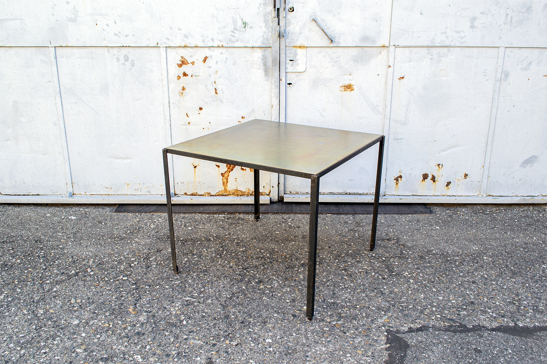 Tavolo con struttura in ferro e piano in lamiera zincata.